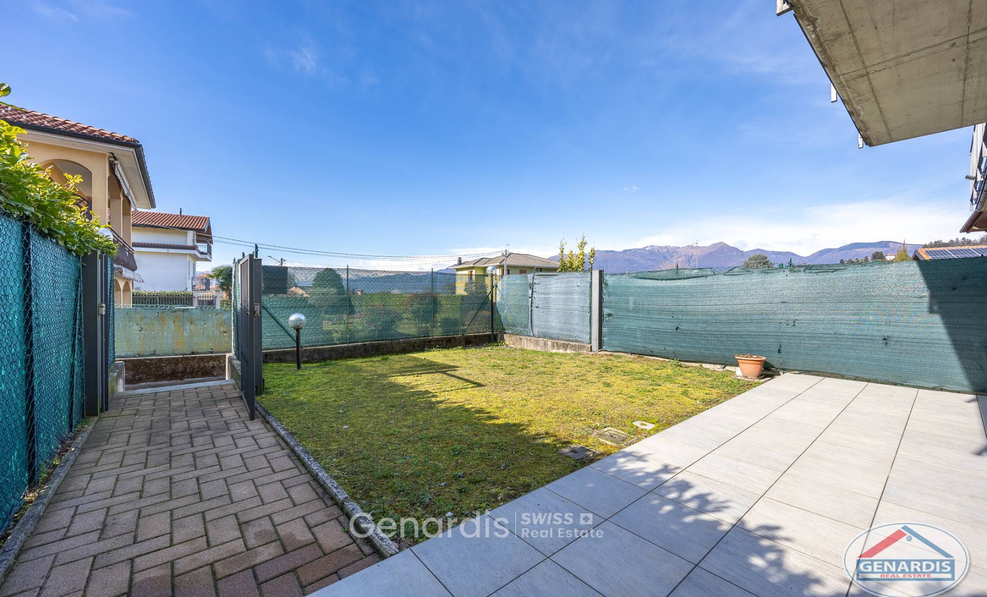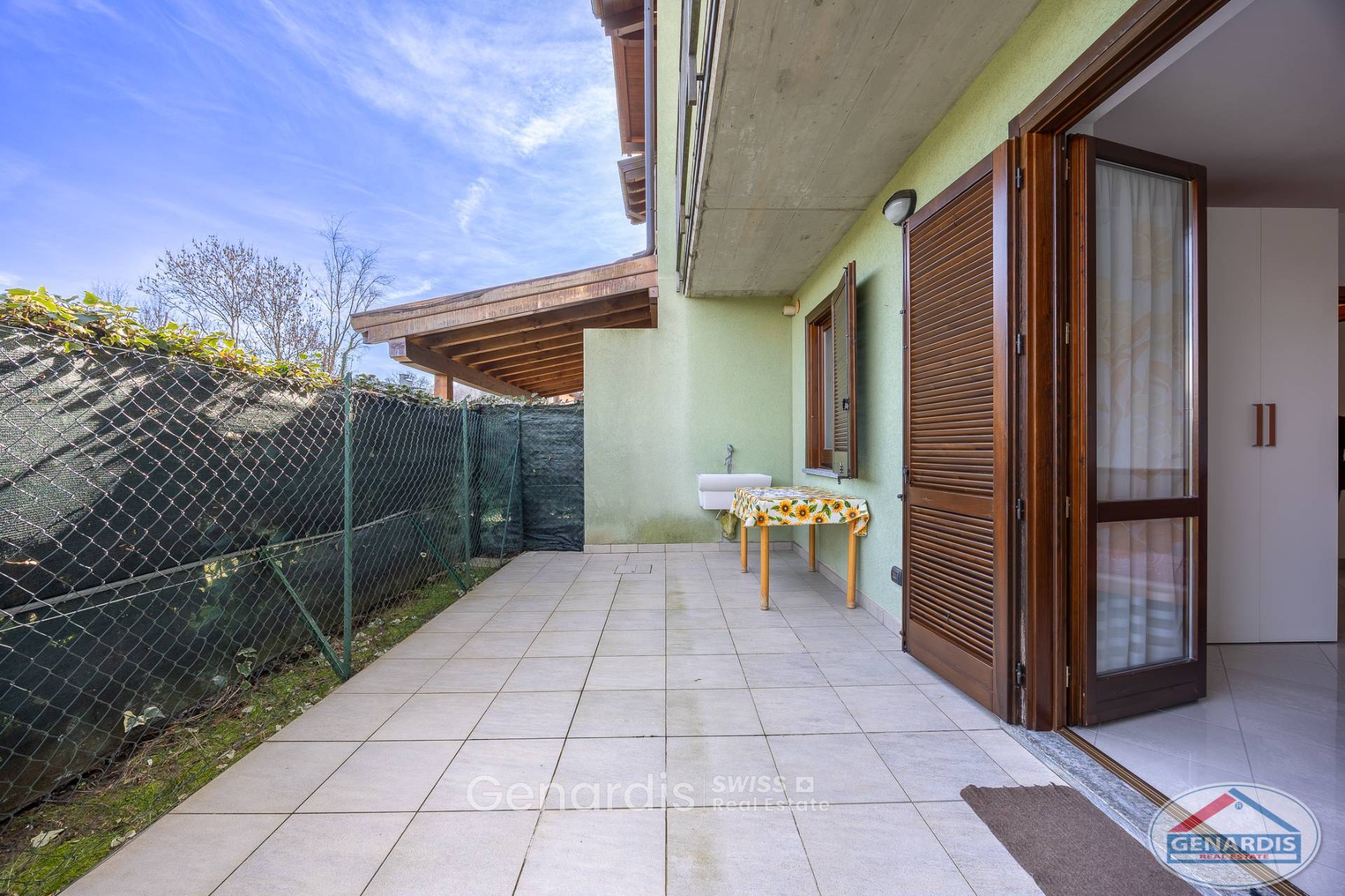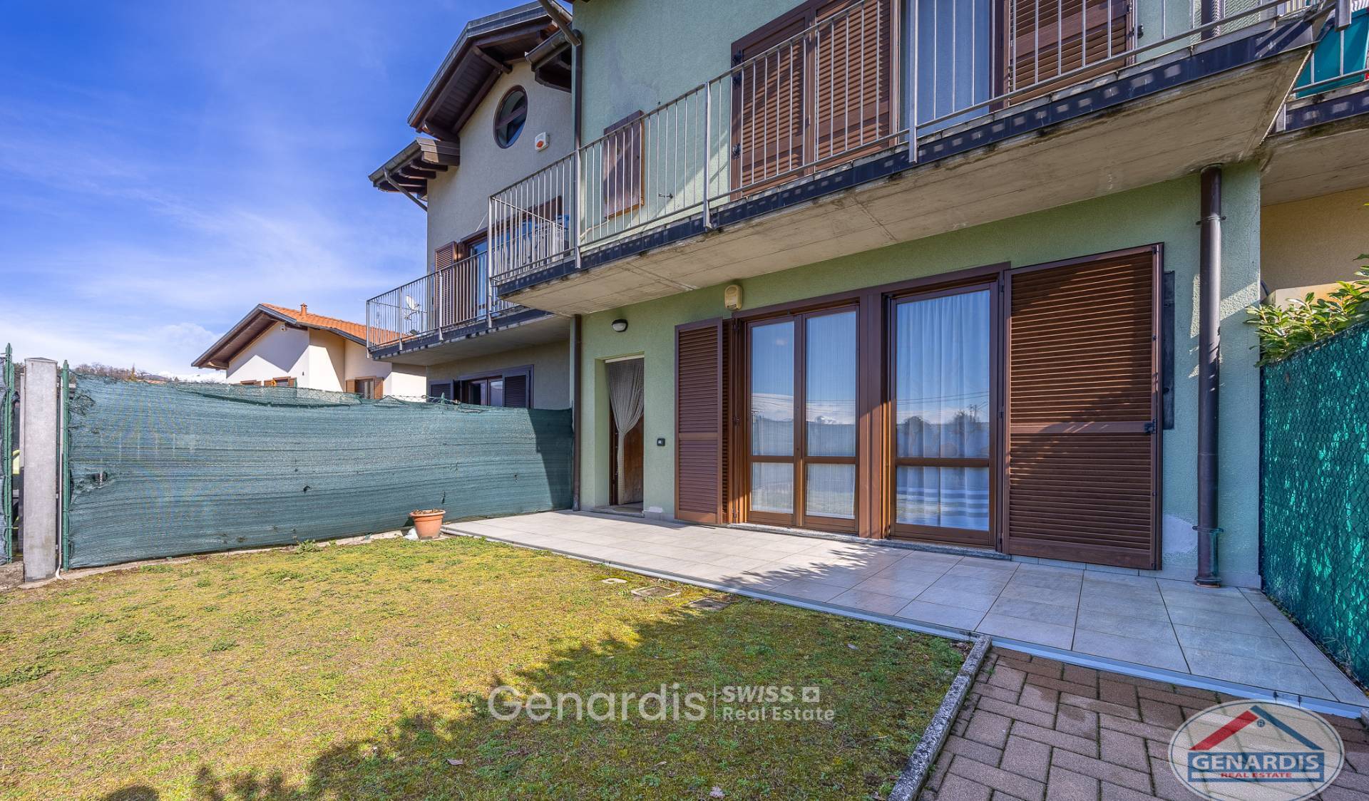 In zona residenziale, in grazioso residence, appartamento al piano terra in villette di soli due piani con ingresso indipendente. Composto da: ingresso, soggiorno con angolo cottura con accesso direttamente al giardino privato, camera matrimoniale sempre con uscita su portico e giardino, cameretta-studio e bagno. Al piano interrato vi è una cantina e taverna, con possibilità di collegamento interno all'appartamento sovrastante. Completano la proprietà un box e un posto auto scoperto.