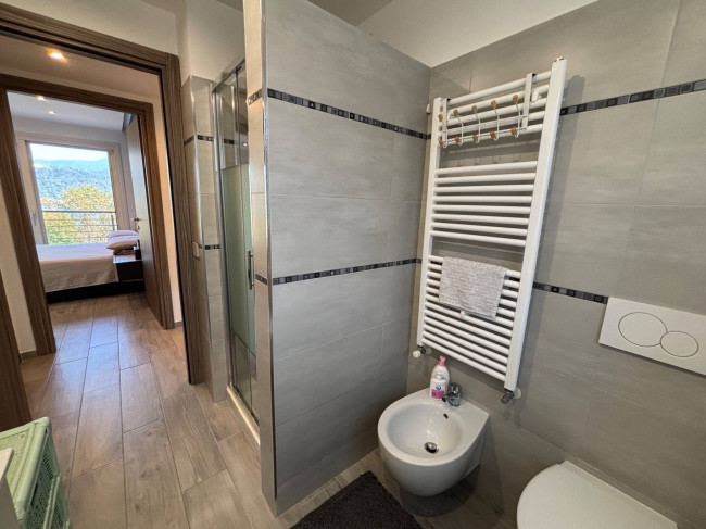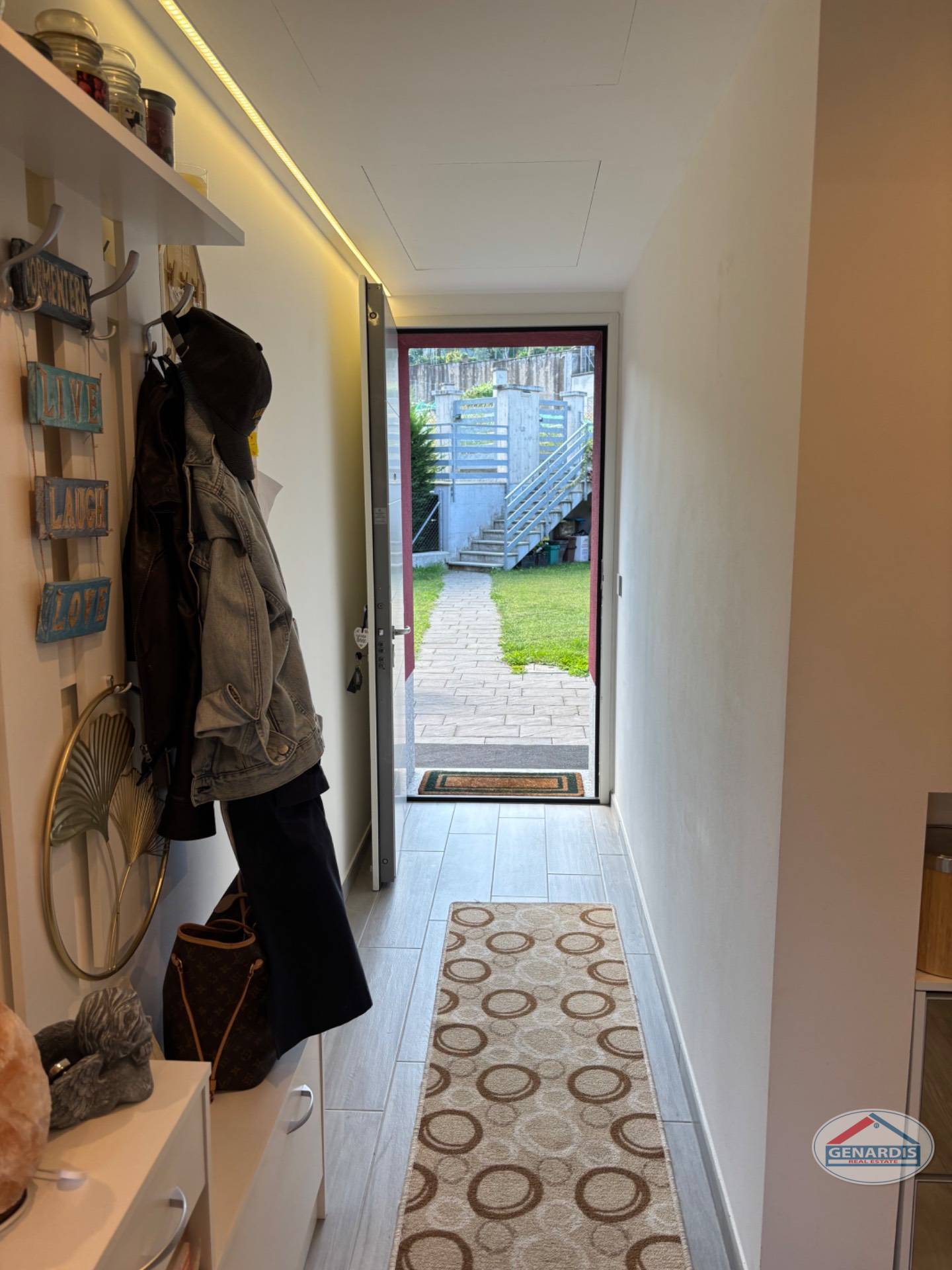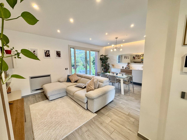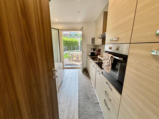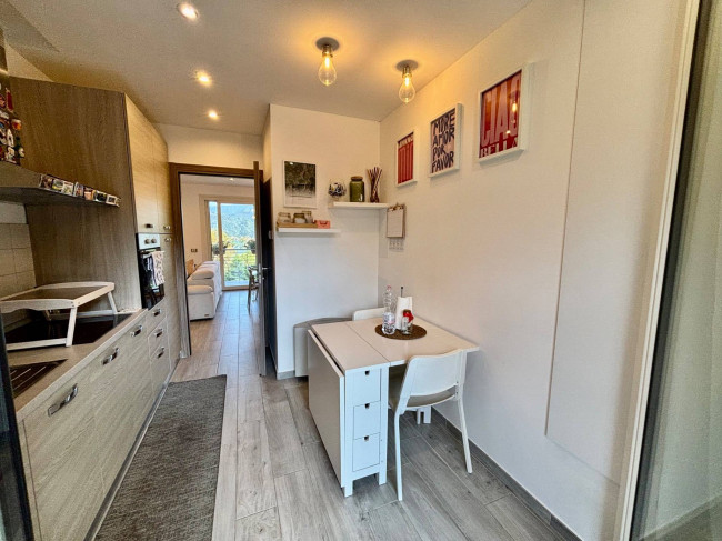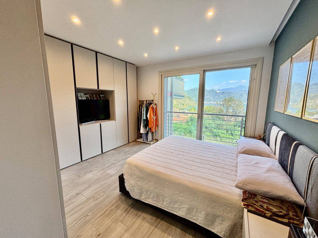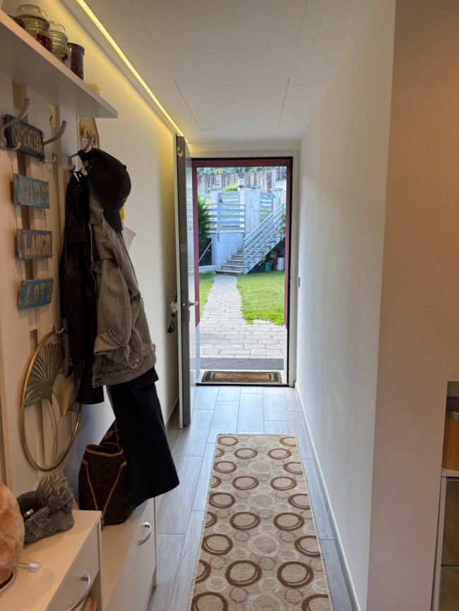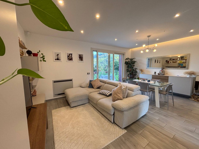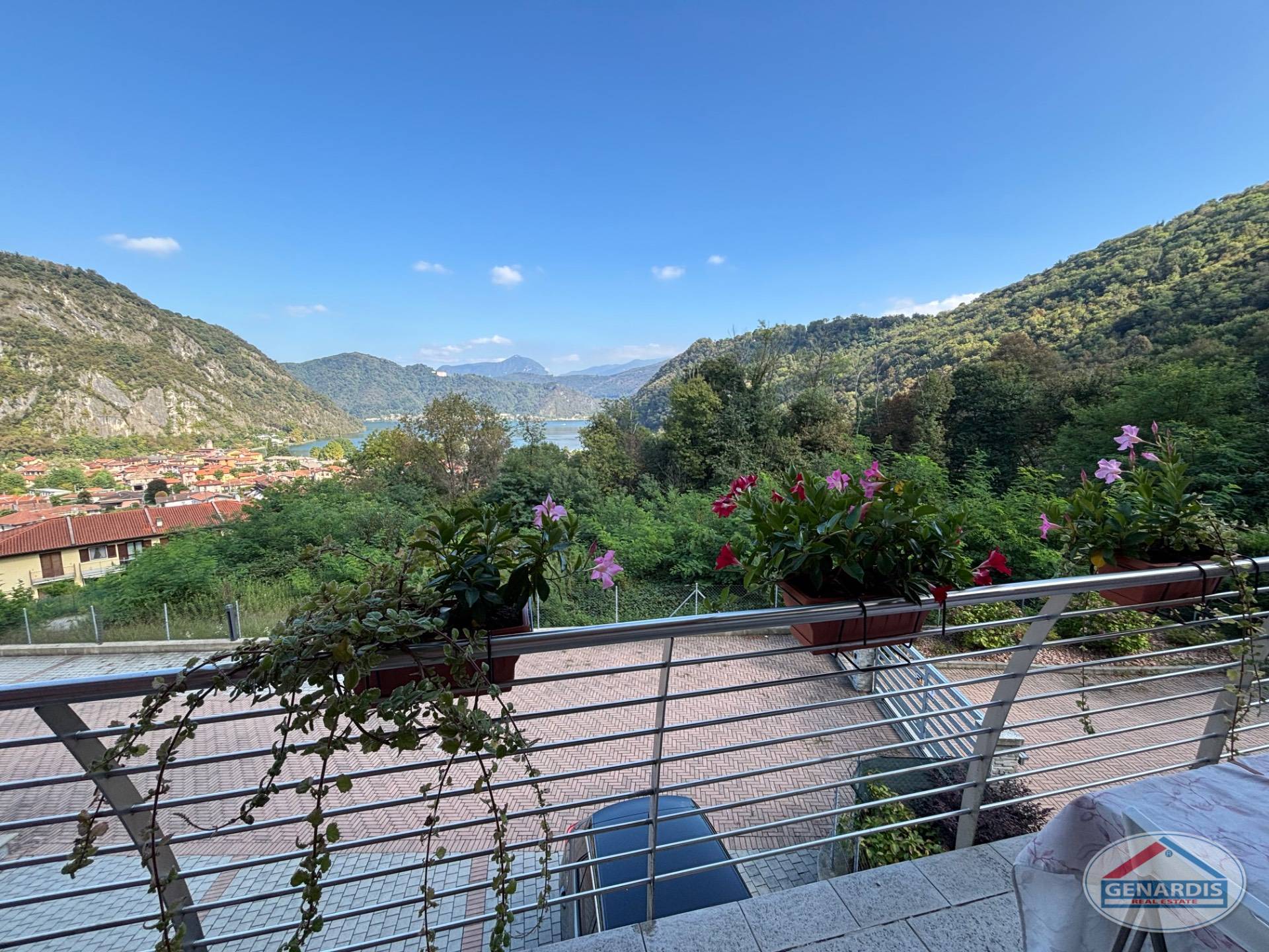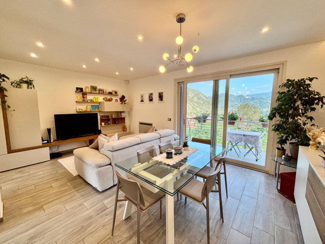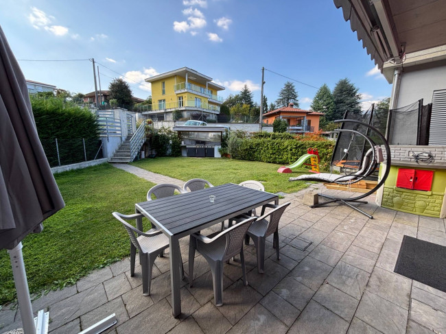L'appartamento di 115 mq è composto da un soggiorno luminoso con accesso al terrazzo dal quale si gode di una bella vista sul Ceresio, due camere da letto di cui una con balcone e vista panoramica, una cucina separata ed accessoriata dalla quale si esce sul giardino privato di 130 mq in parte terrazzato, un bagno finestrato con doccia e bidet.