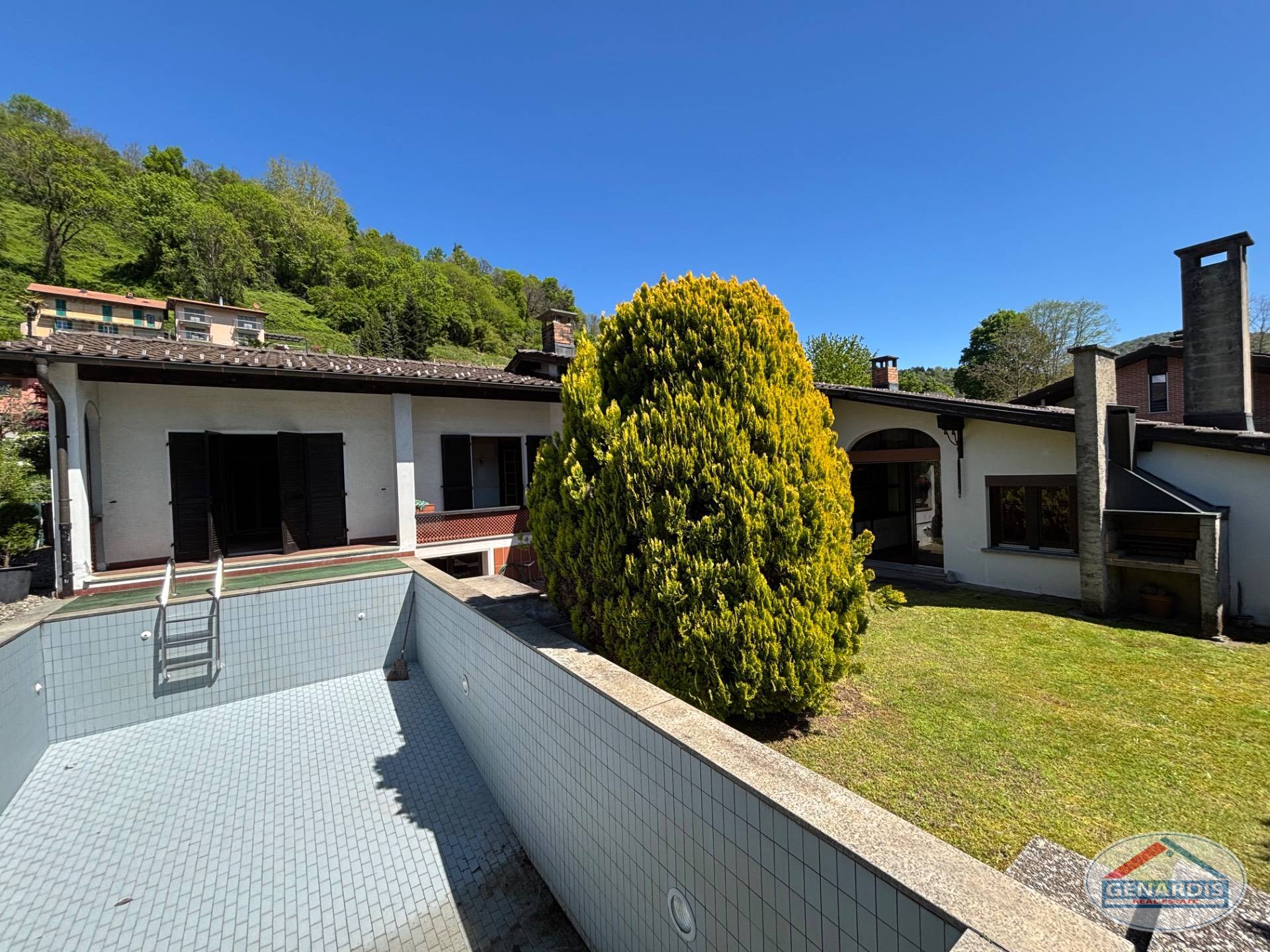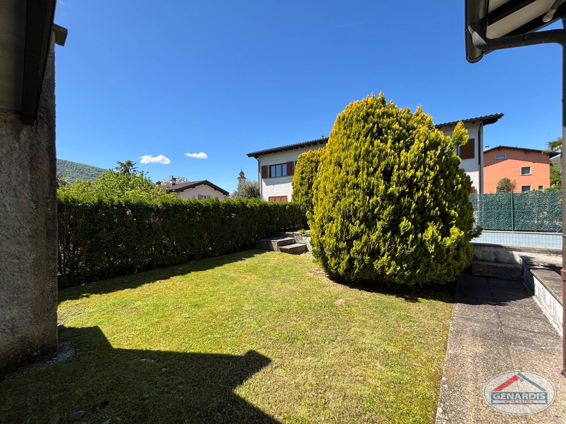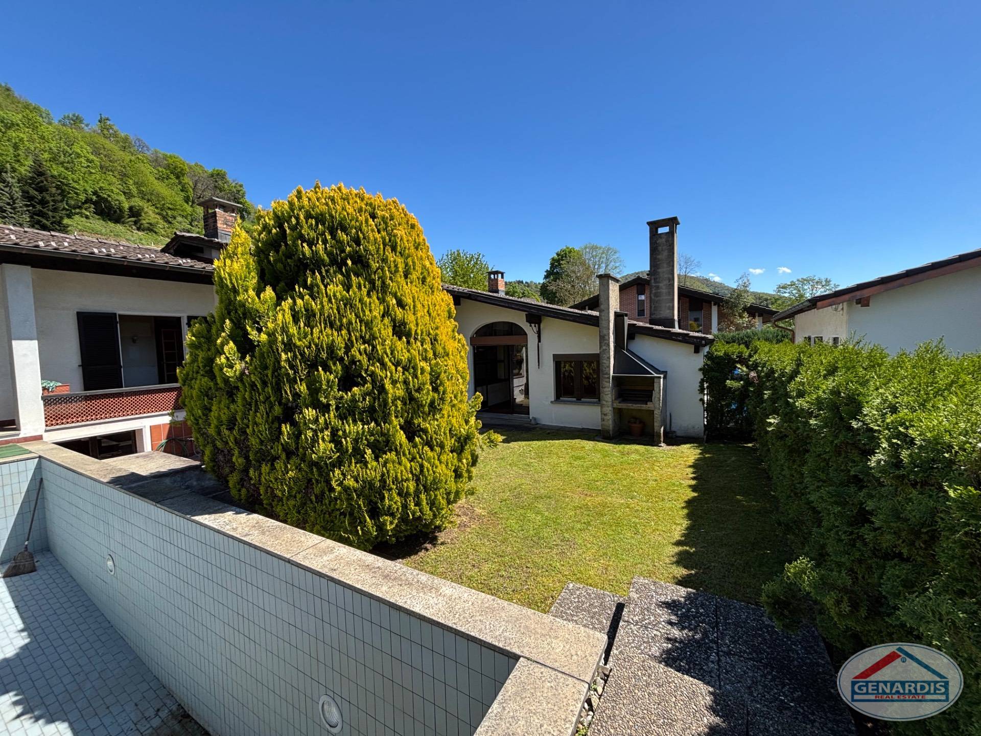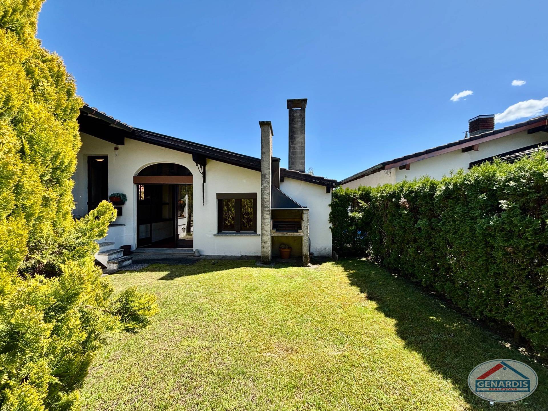 All'esterno un bel giardino pianeggiante circonda la villa, una piscina di medie dimensioni rinfresca d'estate, ed un box per due auto + un posteggio esterno completano il tutto.