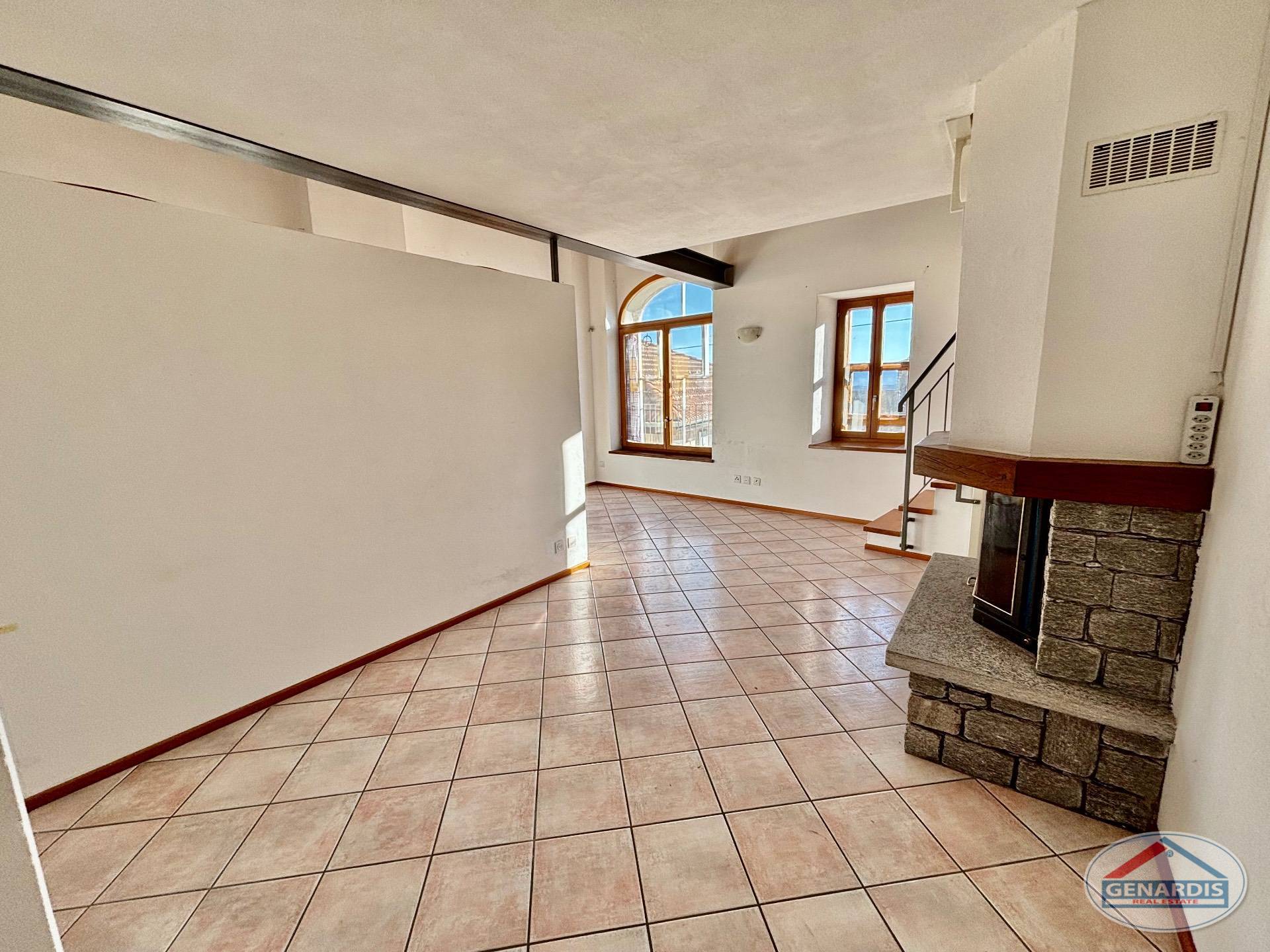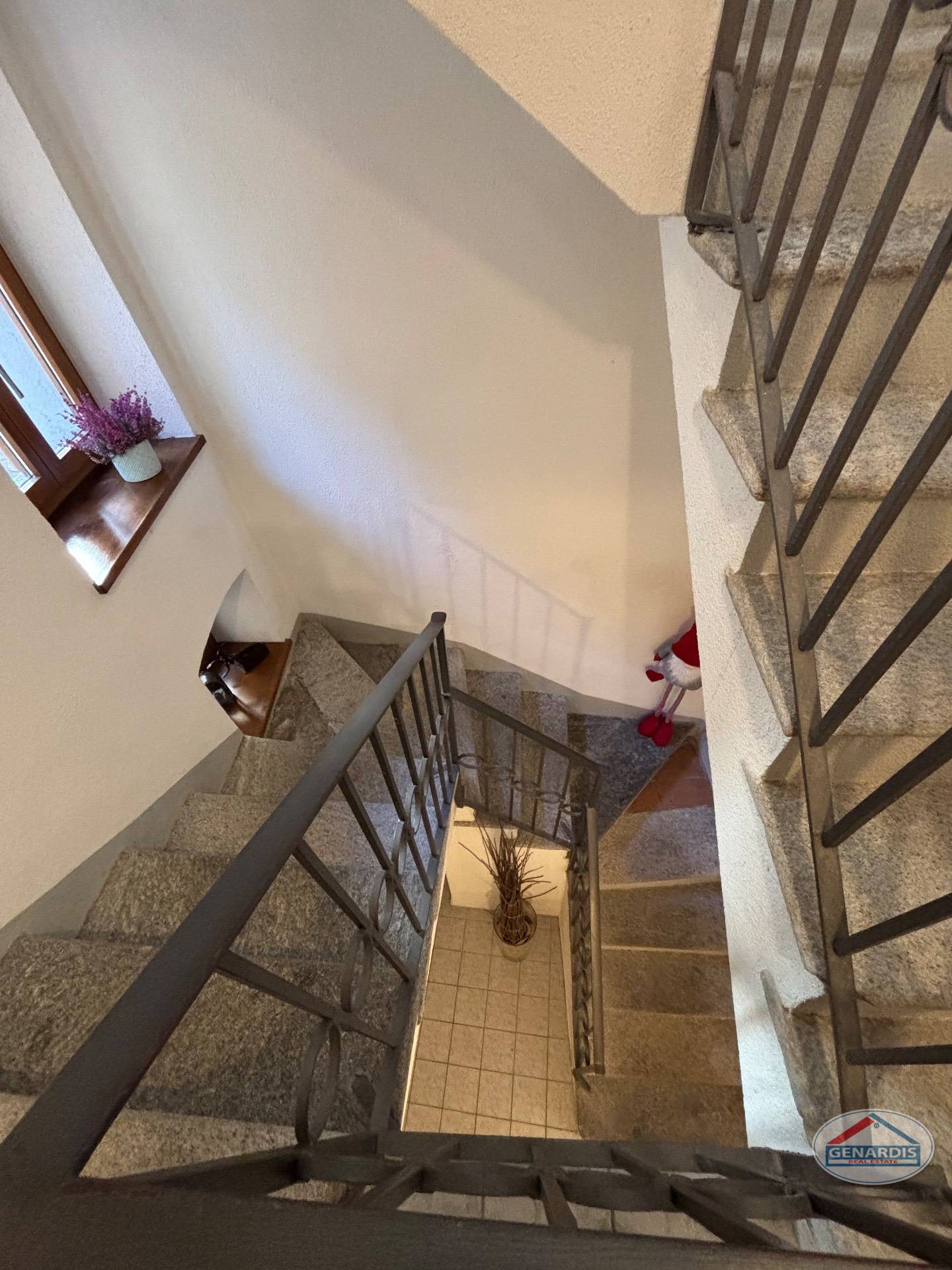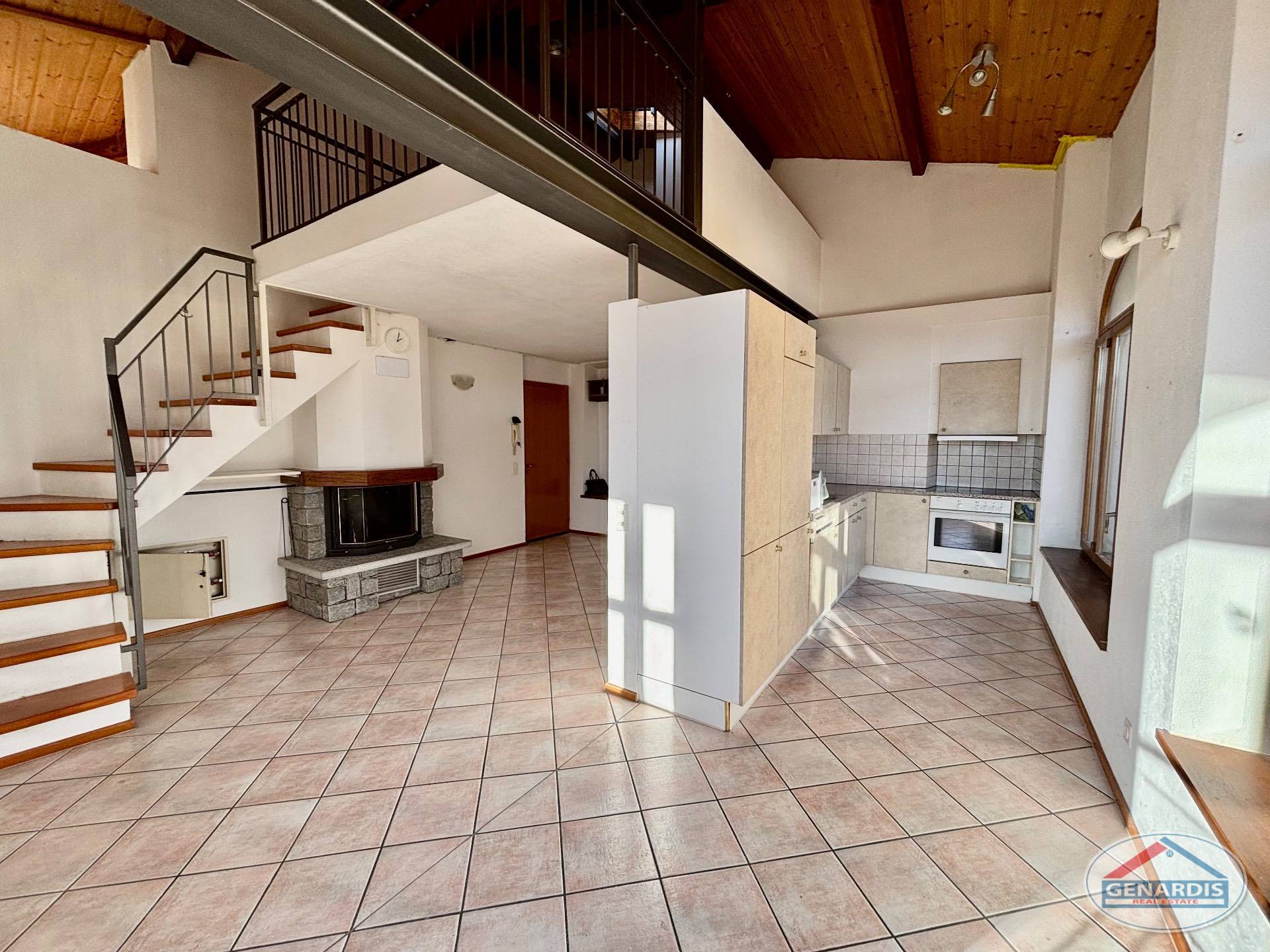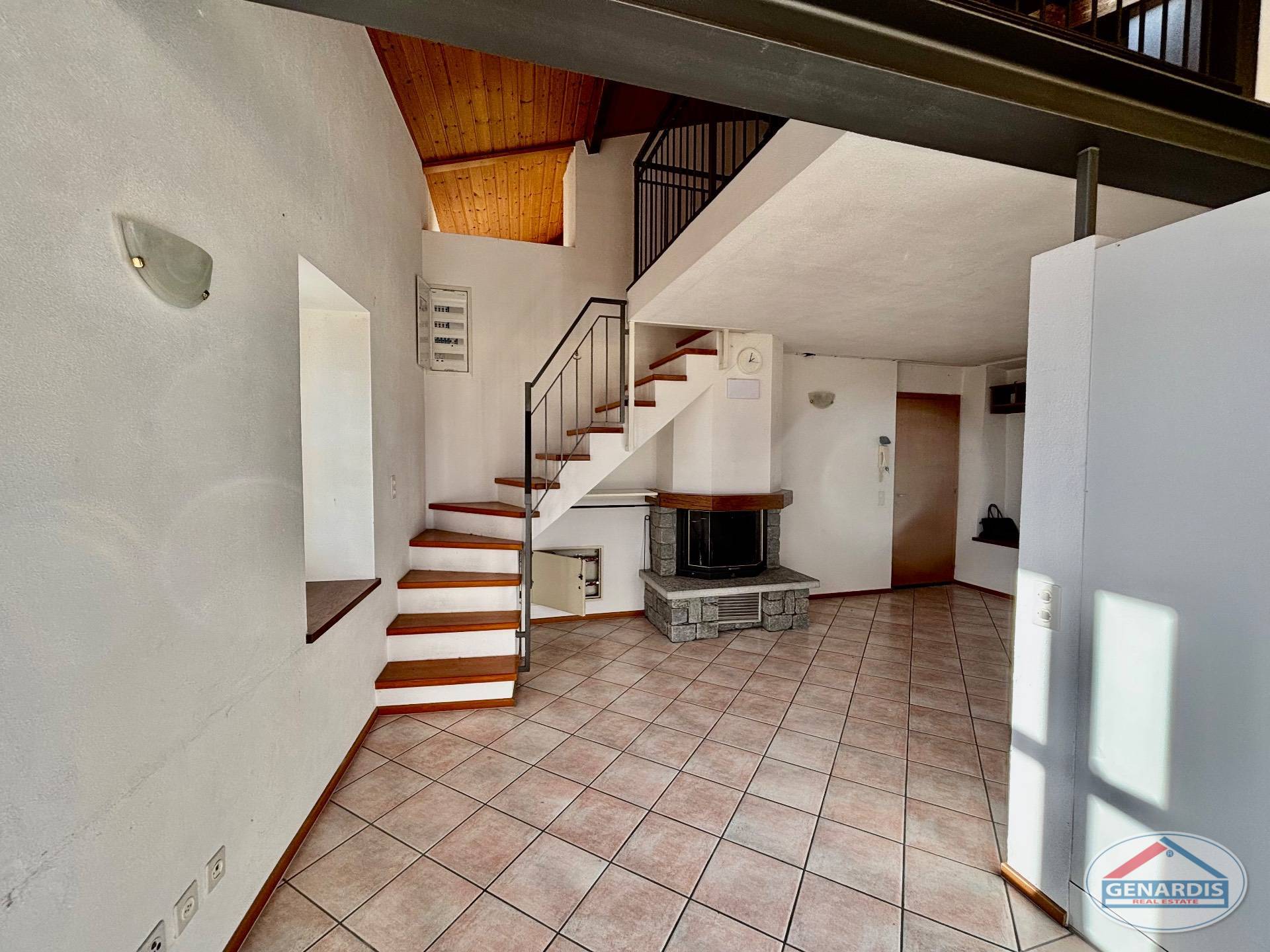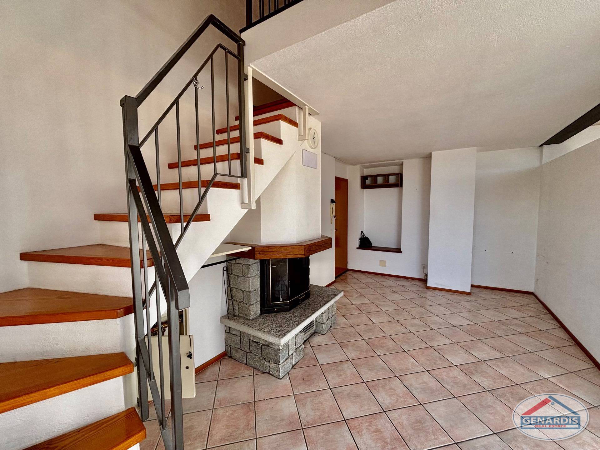 L'appartamento al primo piano, in ottimo stato, è composto da 4 locali distribuiti su due piani. Al piano terreno si trovano un luminoso soggiorno con camino, dal quale si accede al balcone ed al giardino terrazzato un livello più basso, una cucina moderna ed attrezzata anch'essa con uscita sul balcone, ed un bagno con doccia e lavasciuga. Al piano superiore si trova la camera da letto matrimoniale con il bagno molto ampio con vasca e finestra, ed un locale attualmente adibito ad ufficio.