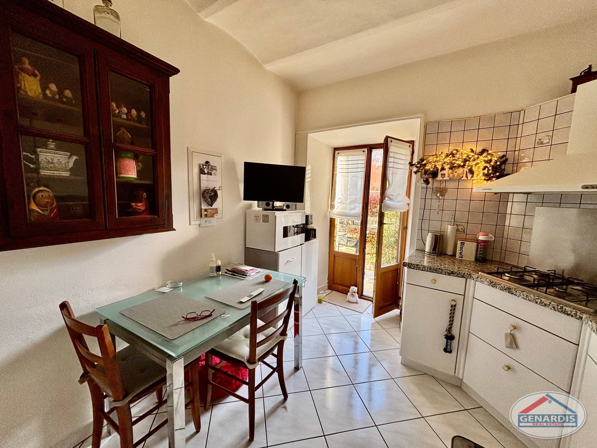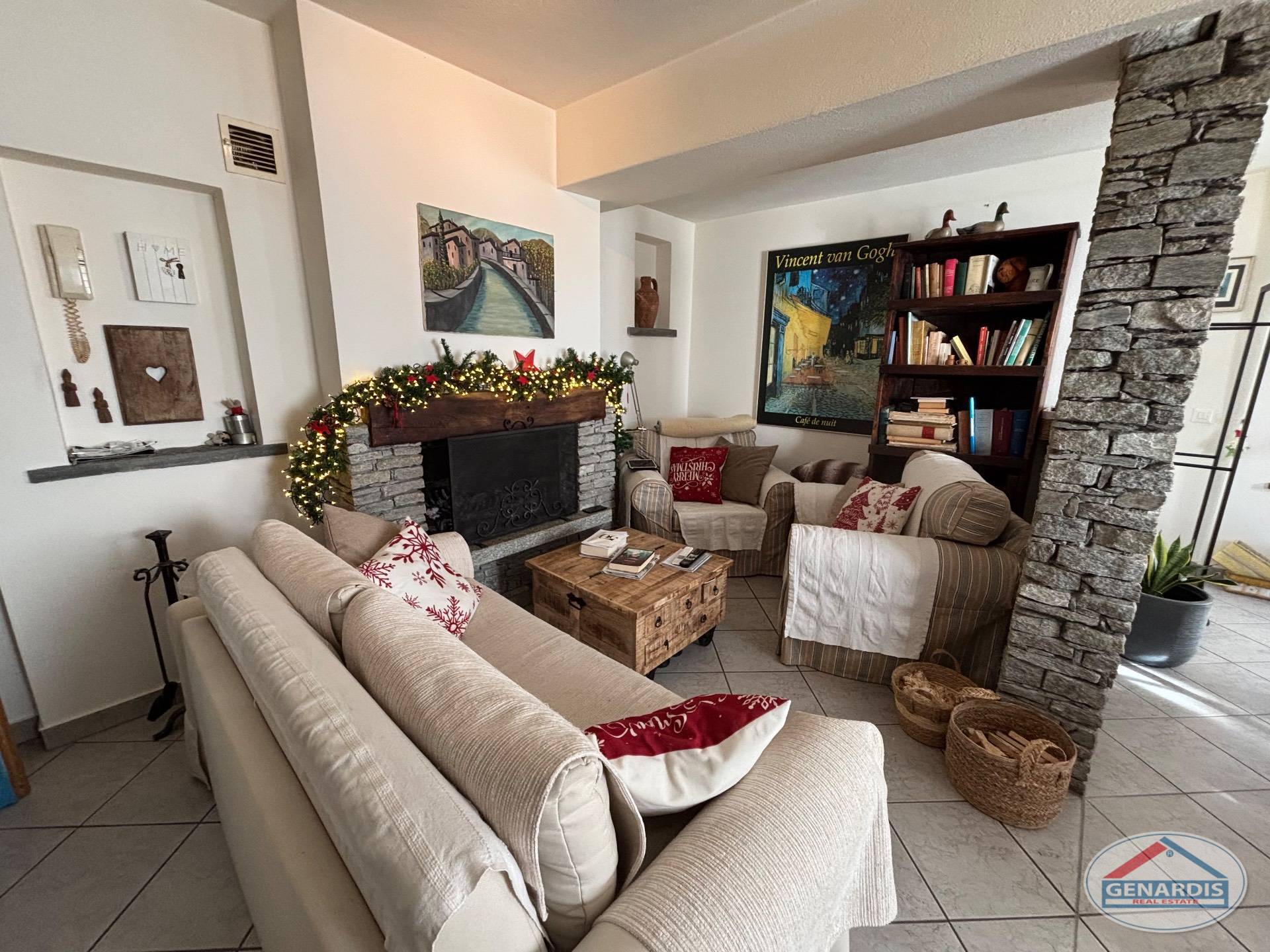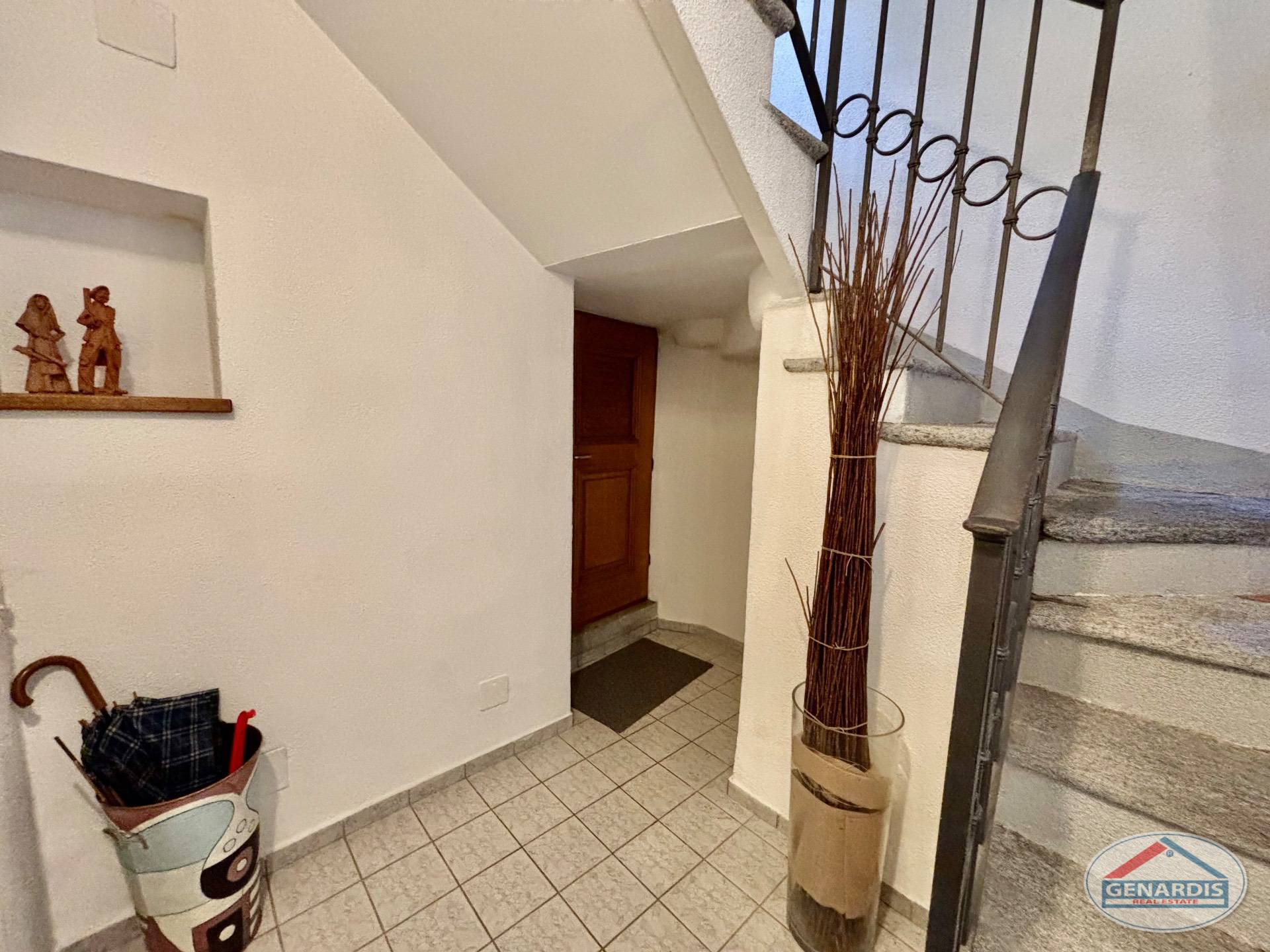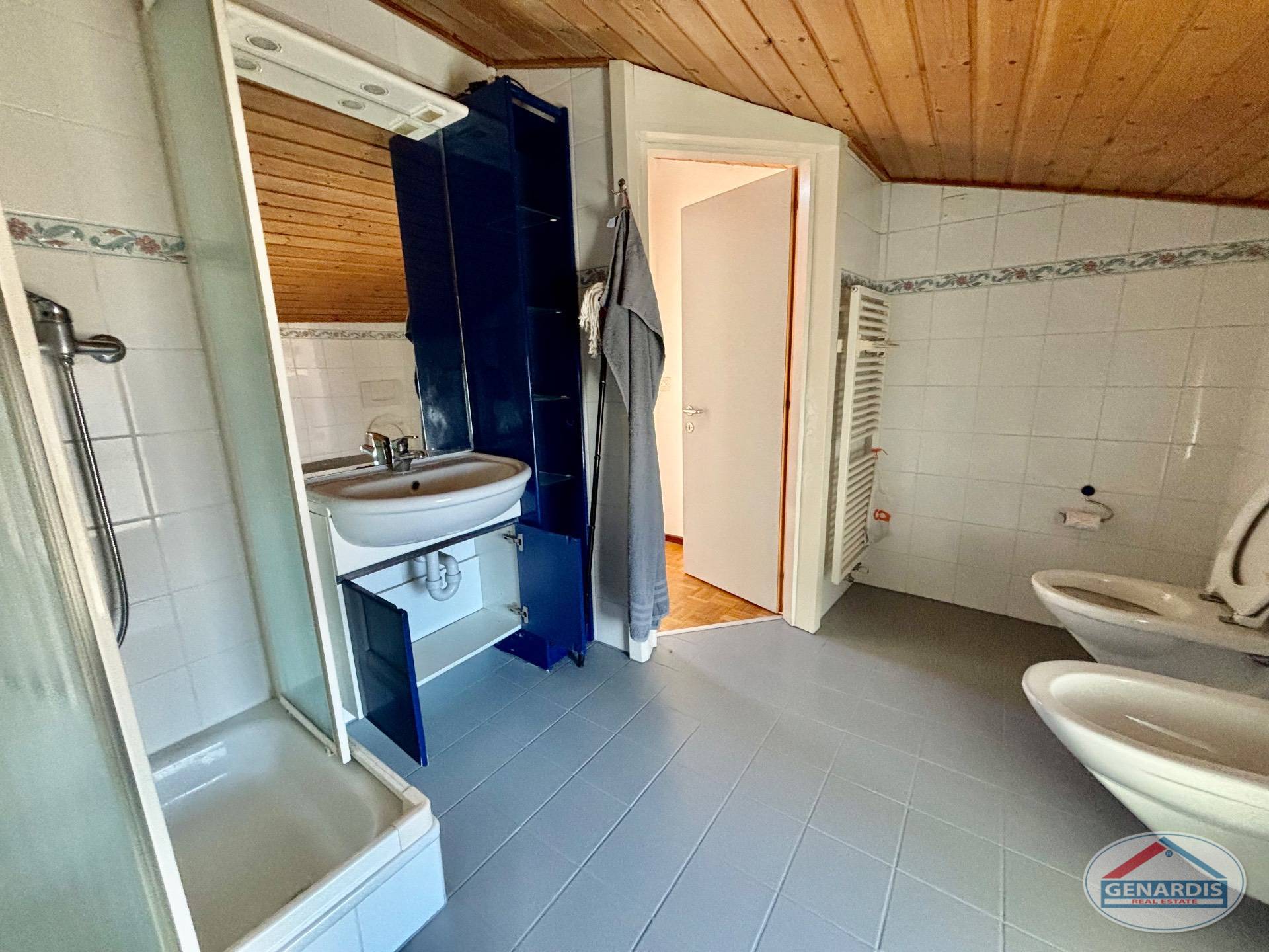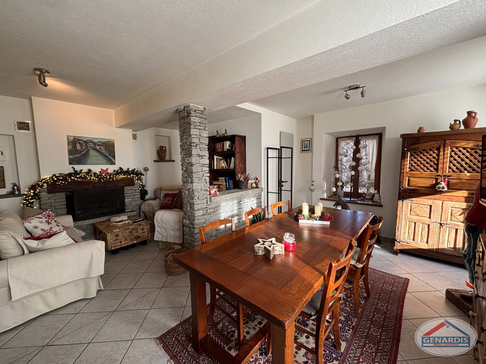 L'appartamento al primo piano, in ottimo stato, è composto da 4 locali distribuiti su due piani. Al piano terreno si trovano un luminoso soggiorno con camino, dal quale si accede al balcone ed al giardino terrazzato un livello più basso, una cucina moderna ed attrezzata anch'essa con uscita sul balcone, ed un bagno con doccia e lavasciuga. Al piano superiore si trova la camera da letto matrimoniale con il bagno molto ampio con vasca e finestra, ed un locale attualmente adibito ad ufficio.