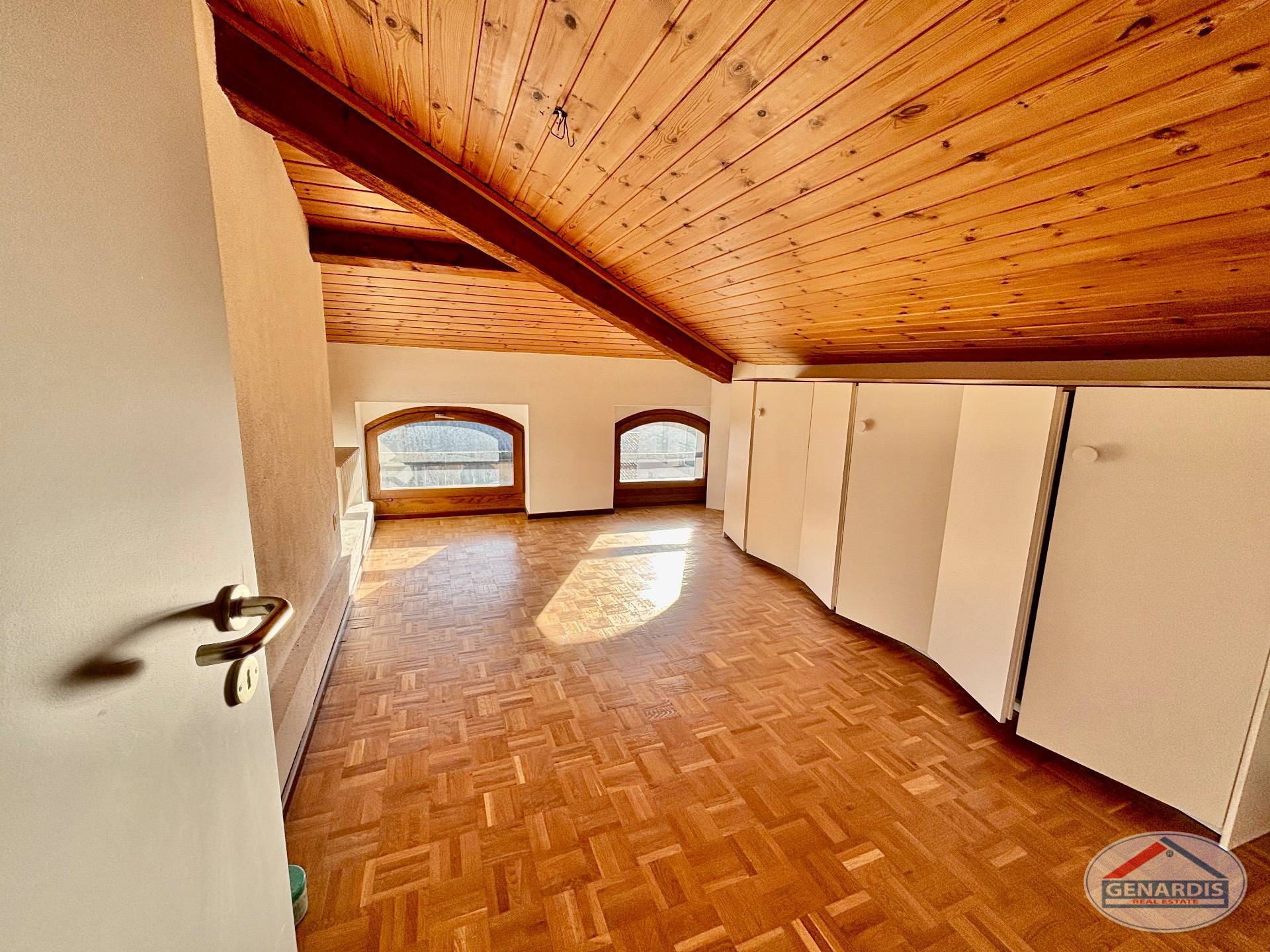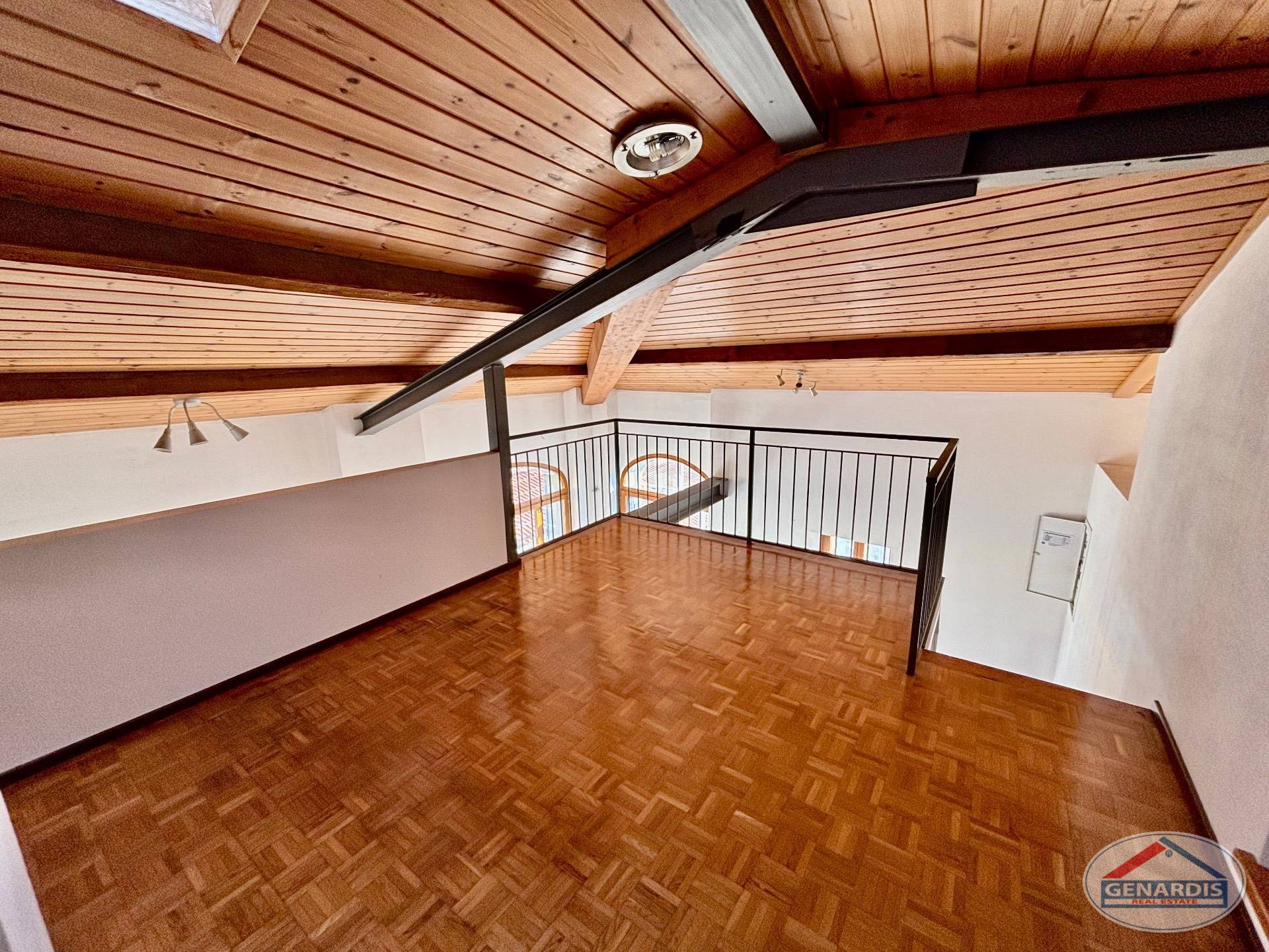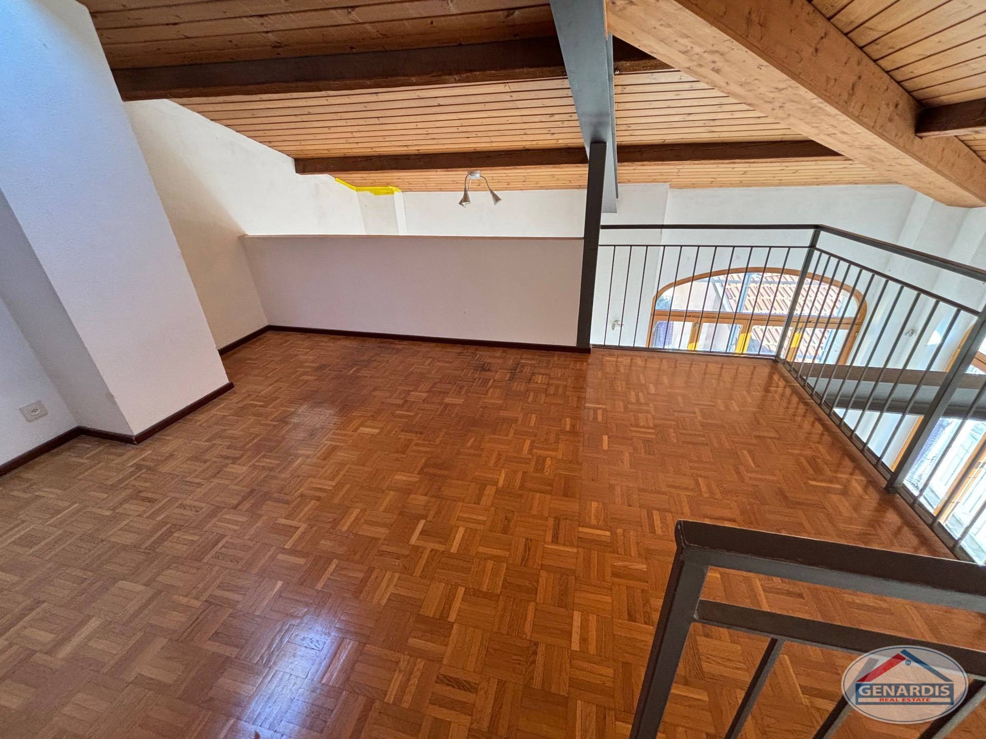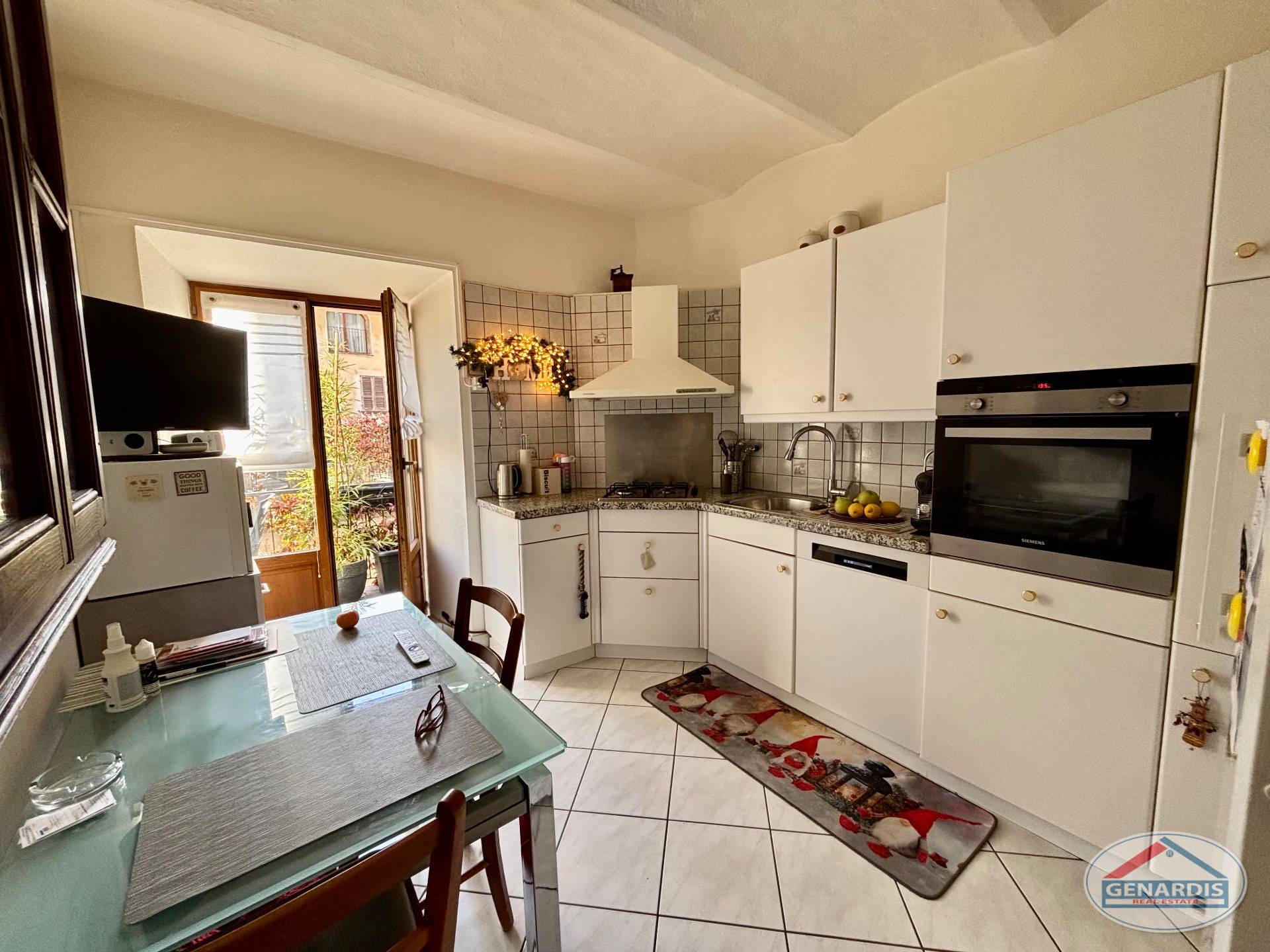 L'appartamento al primo piano, in ottimo stato, è composto da 4 locali distribuiti su due piani. Al piano terreno si trovano un luminoso soggiorno con camino, dal quale si accede al balcone ed al giardino terrazzato un livello più basso, una cucina moderna ed attrezzata anch'essa con uscita sul balcone, ed un bagno con doccia e lavasciuga. Al piano superiore si trova la camera da letto matrimoniale con il bagno molto ampio con vasca e finestra, ed un locale attualmente adibito ad ufficio.