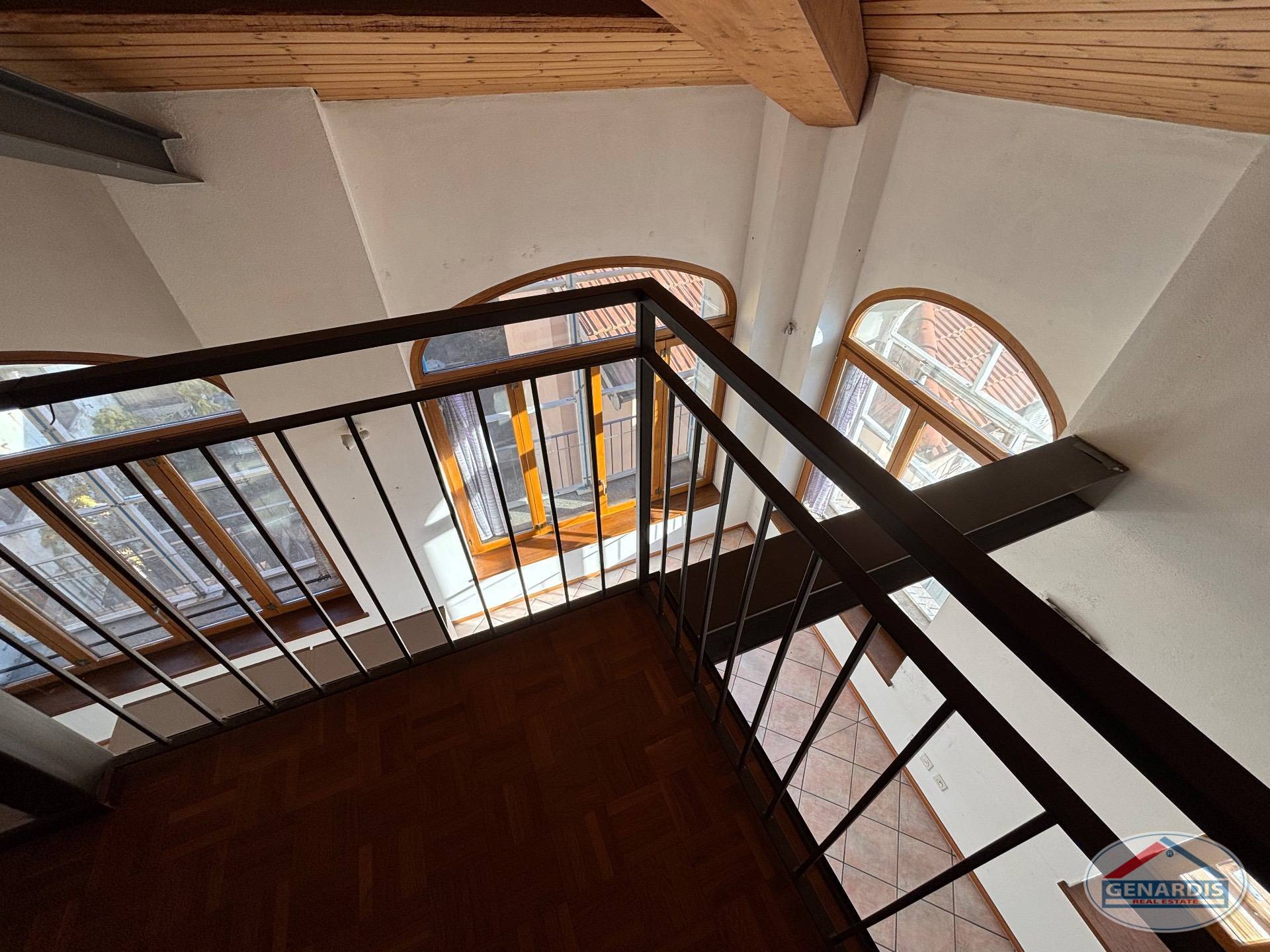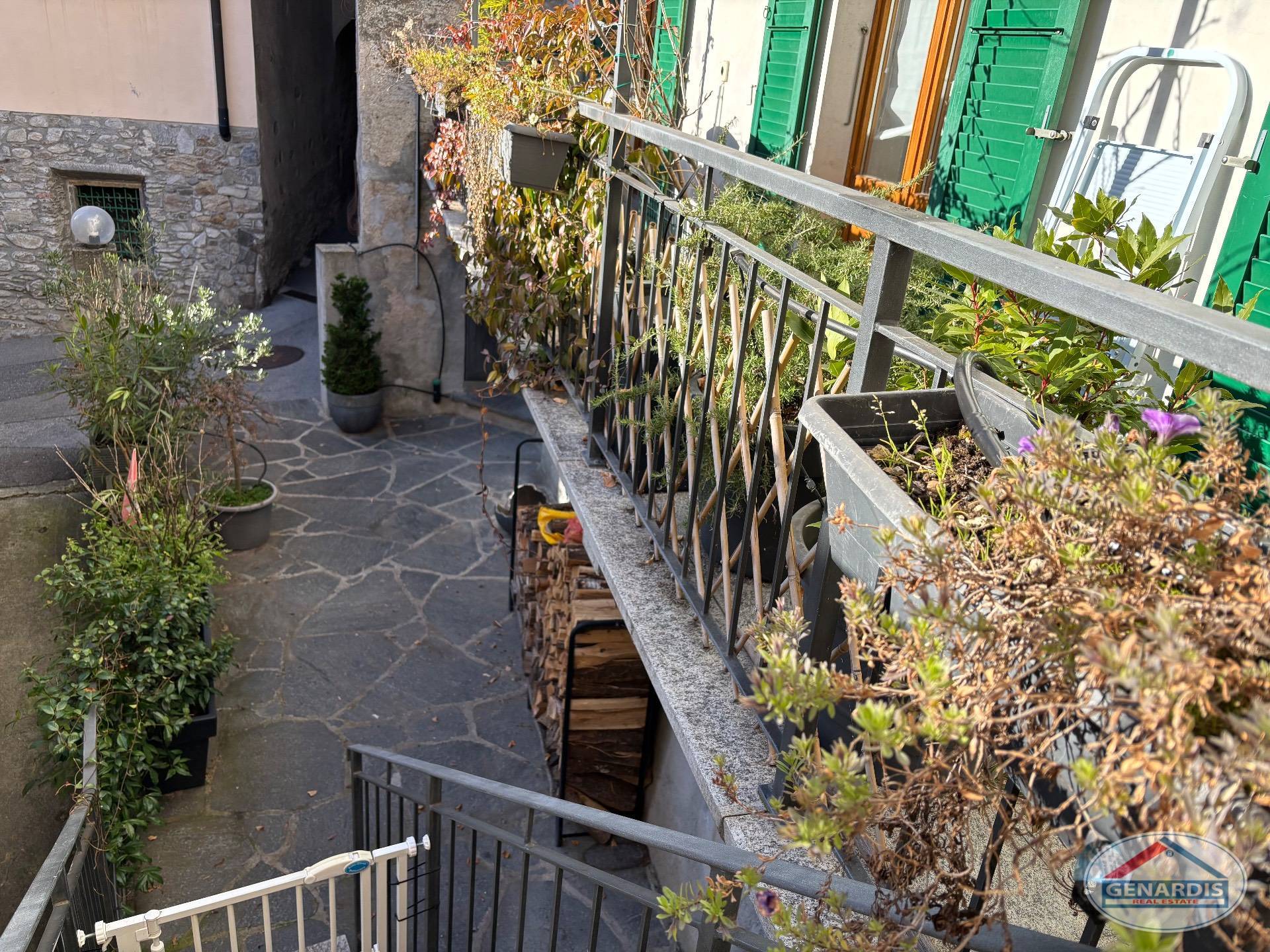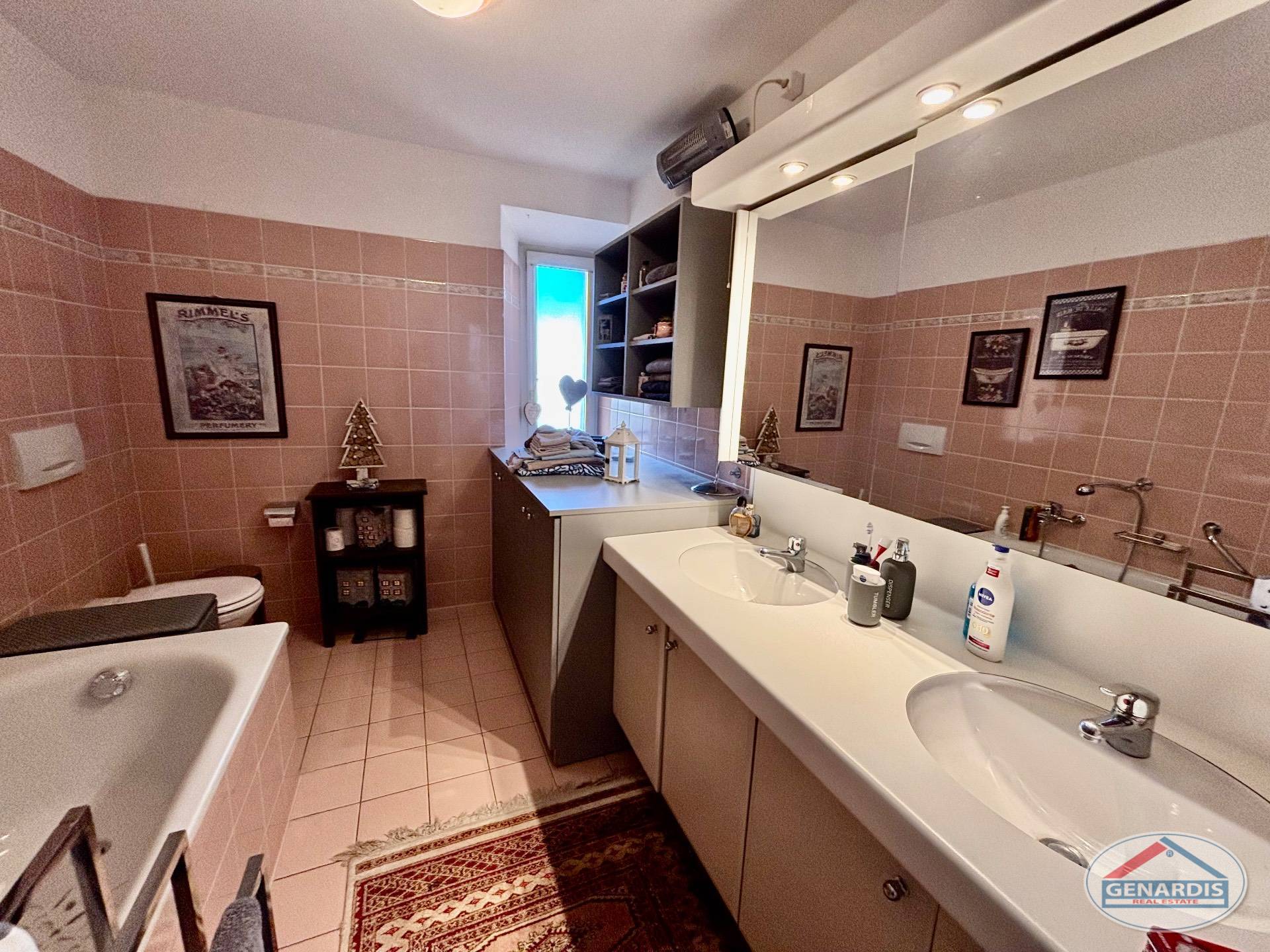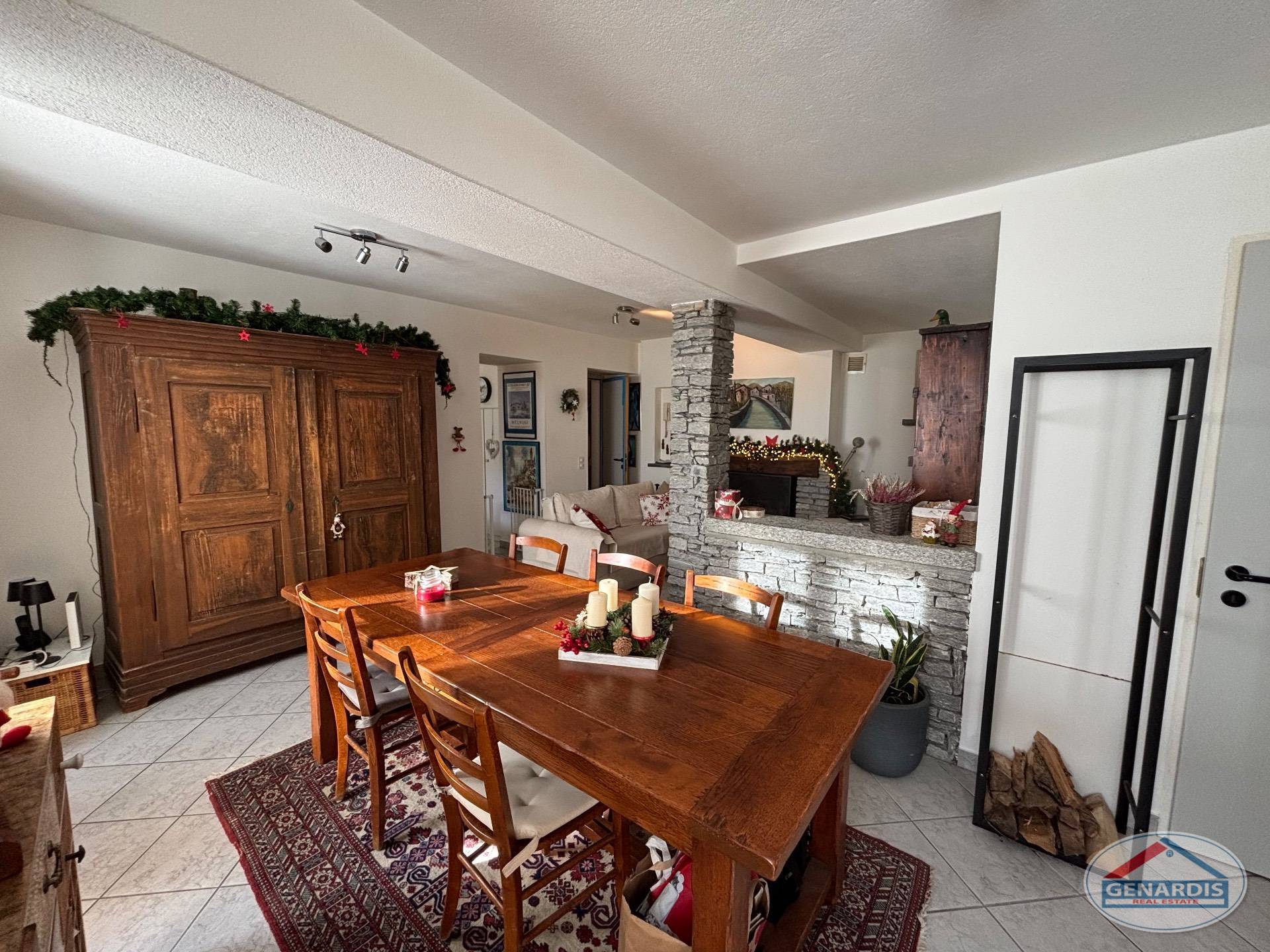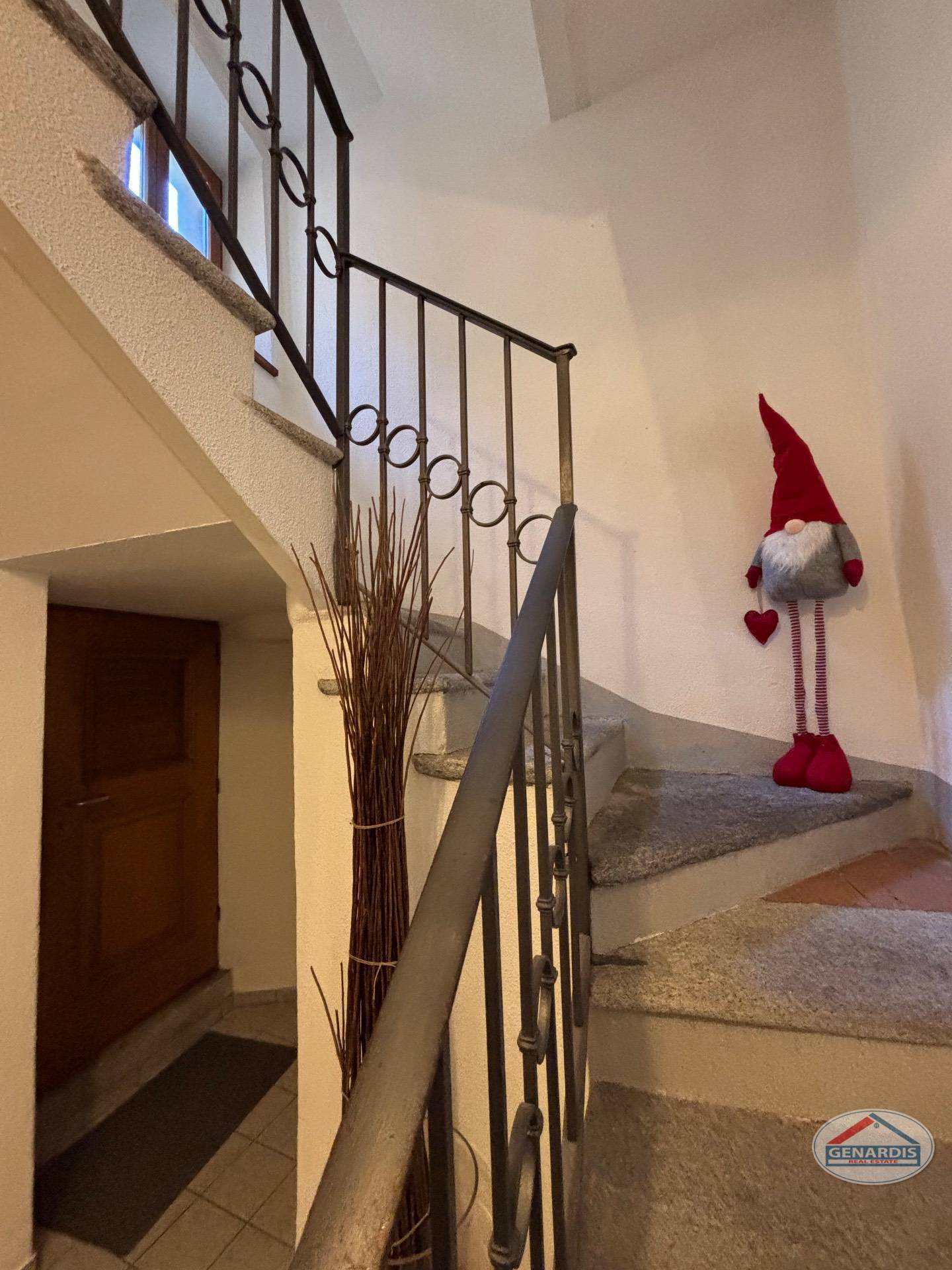 L'appartamento al primo piano, in ottimo stato, è composto da 4 locali distribuiti su due piani. Al piano terreno si trovano un luminoso soggiorno con camino, dal quale si accede al balcone ed al giardino terrazzato un livello più basso, una cucina moderna ed attrezzata anch'essa con uscita sul balcone, ed un bagno con doccia e lavasciuga. Al piano superiore si trova la camera da letto matrimoniale con il bagno molto ampio con vasca e finestra, ed un locale attualmente adibito ad ufficio.
