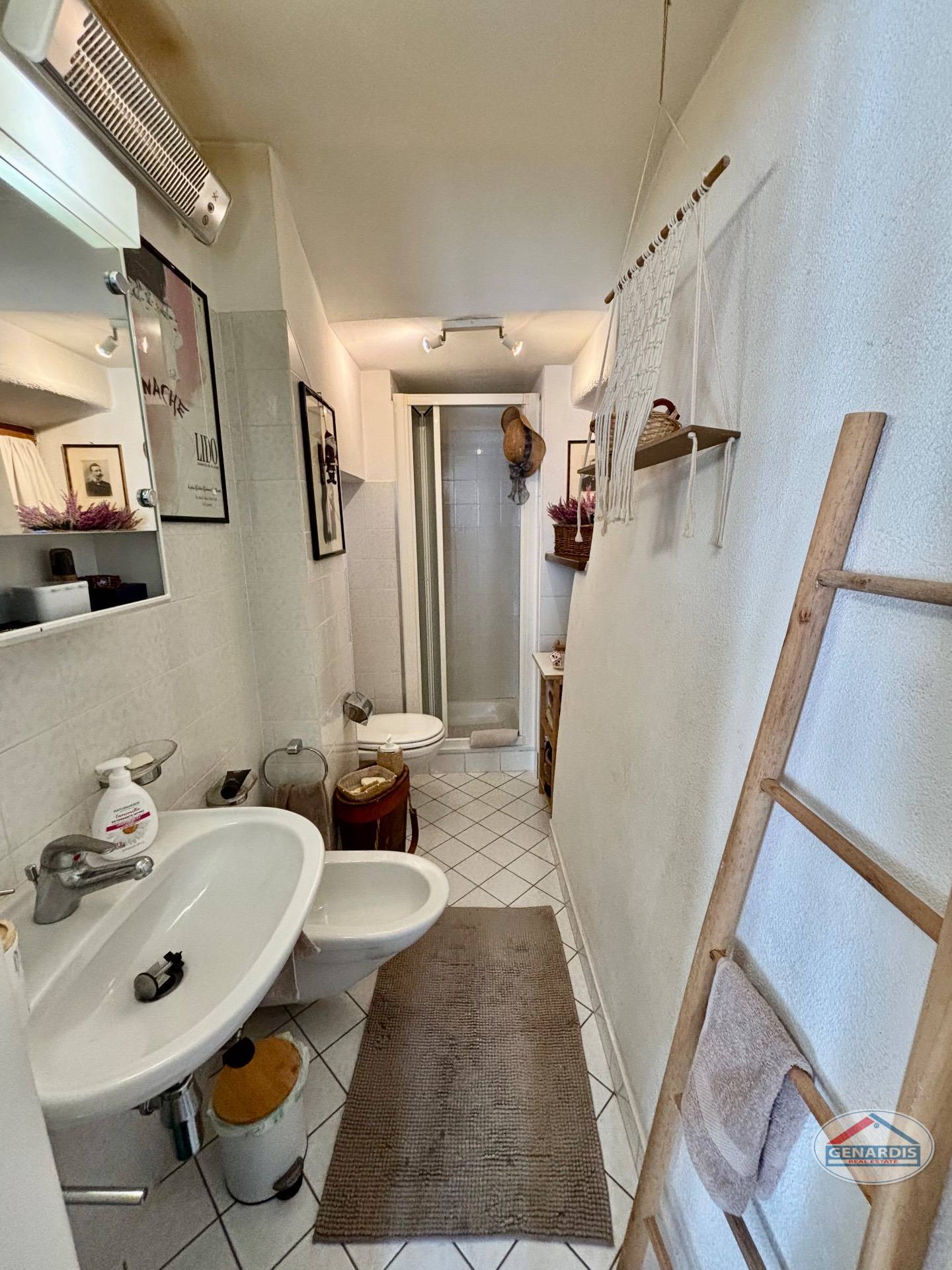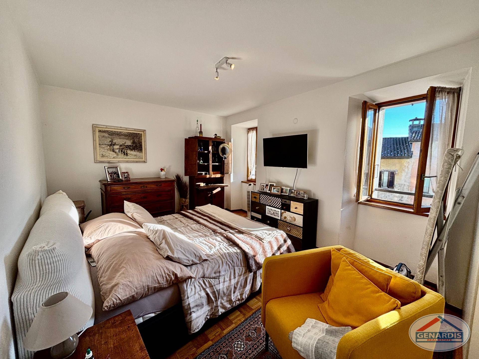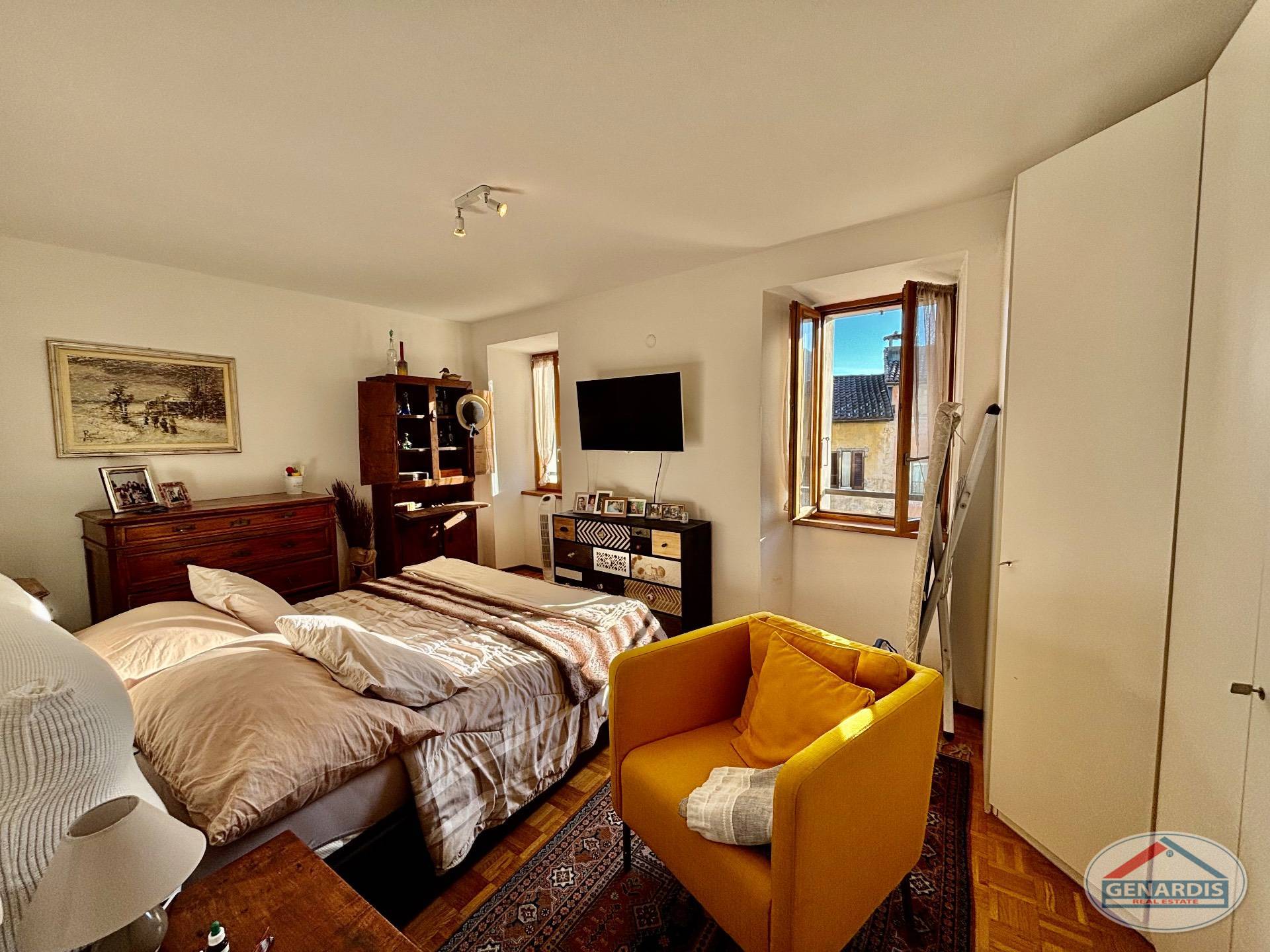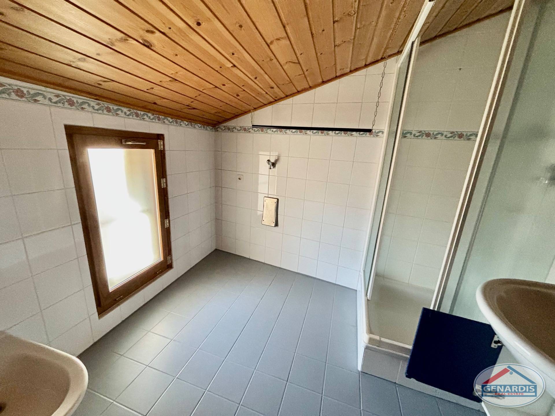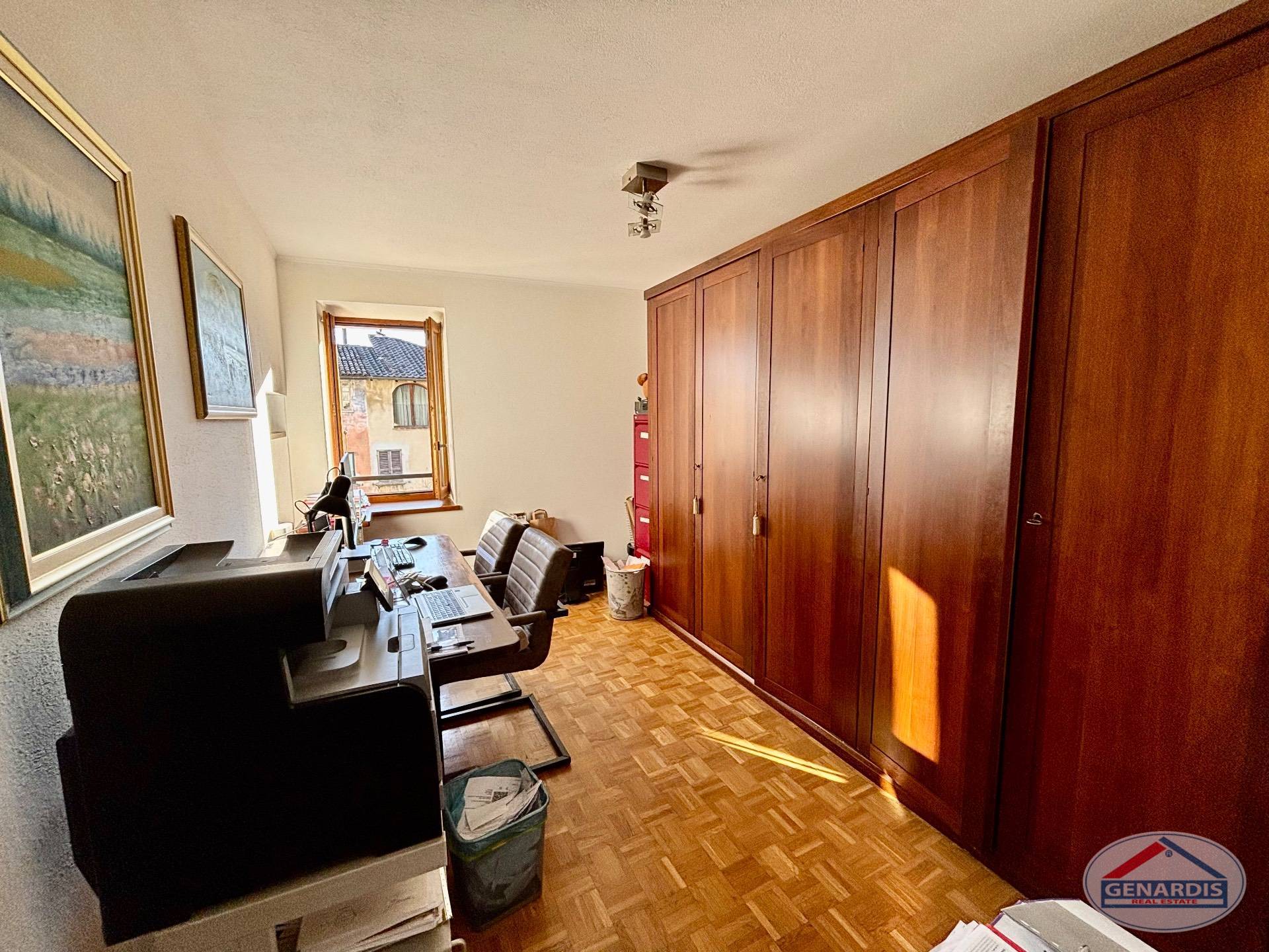 L'appartamento al primo piano, in ottimo stato, è composto da 4 locali distribuiti su due piani. Al piano terreno si trovano un luminoso soggiorno con camino, dal quale si accede al balcone ed al giardino terrazzato un livello più basso, una cucina moderna ed attrezzata anch'essa con uscita sul balcone, ed un bagno con doccia e lavasciuga. Al piano superiore si trova la camera da letto matrimoniale con il bagno molto ampio con vasca e finestra, ed un locale attualmente adibito ad ufficio.