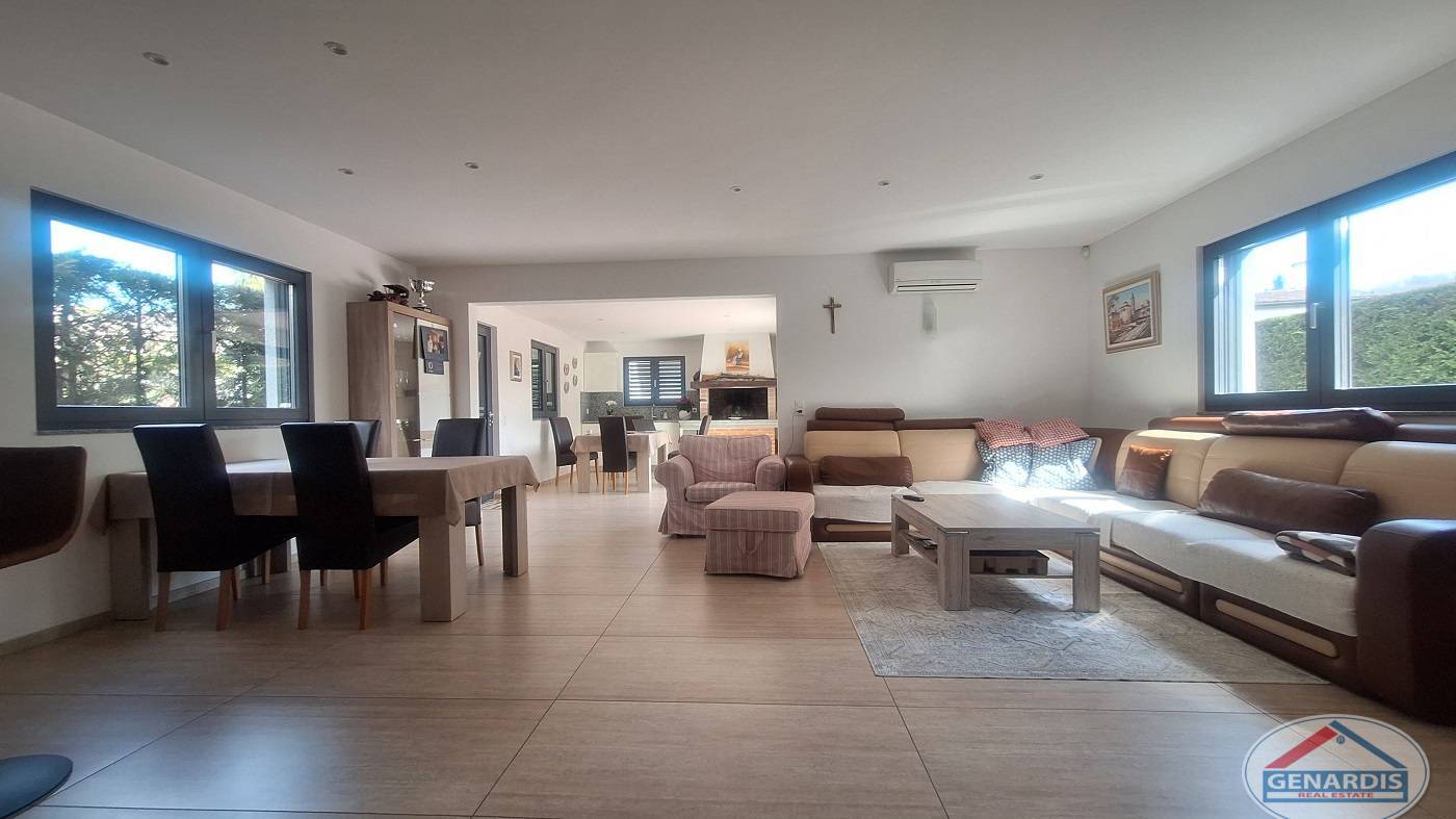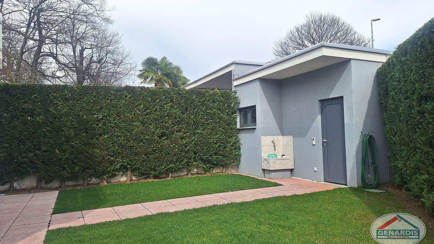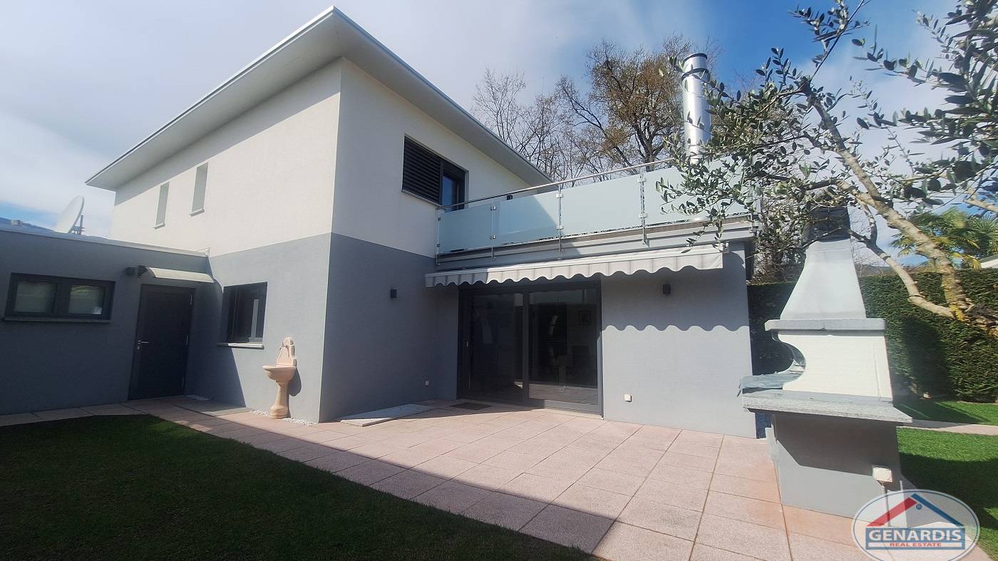 in posizione tranquilla, soleggiata, elegante Villa edificata nel 2017, con materiali di ottima qualità, ben curata, disposta su due piani, oltre al piano interrato, spaziosa luminosa, con grande soggiorno, pranzo con camino, sei camere, tre cucine arredate e accessoriate. Giardino pianeggiante con faretti di illuminazione, irrigazione automatica, angolo barbecue, locale attrezzi, box auto e quattro parcheggi auto.